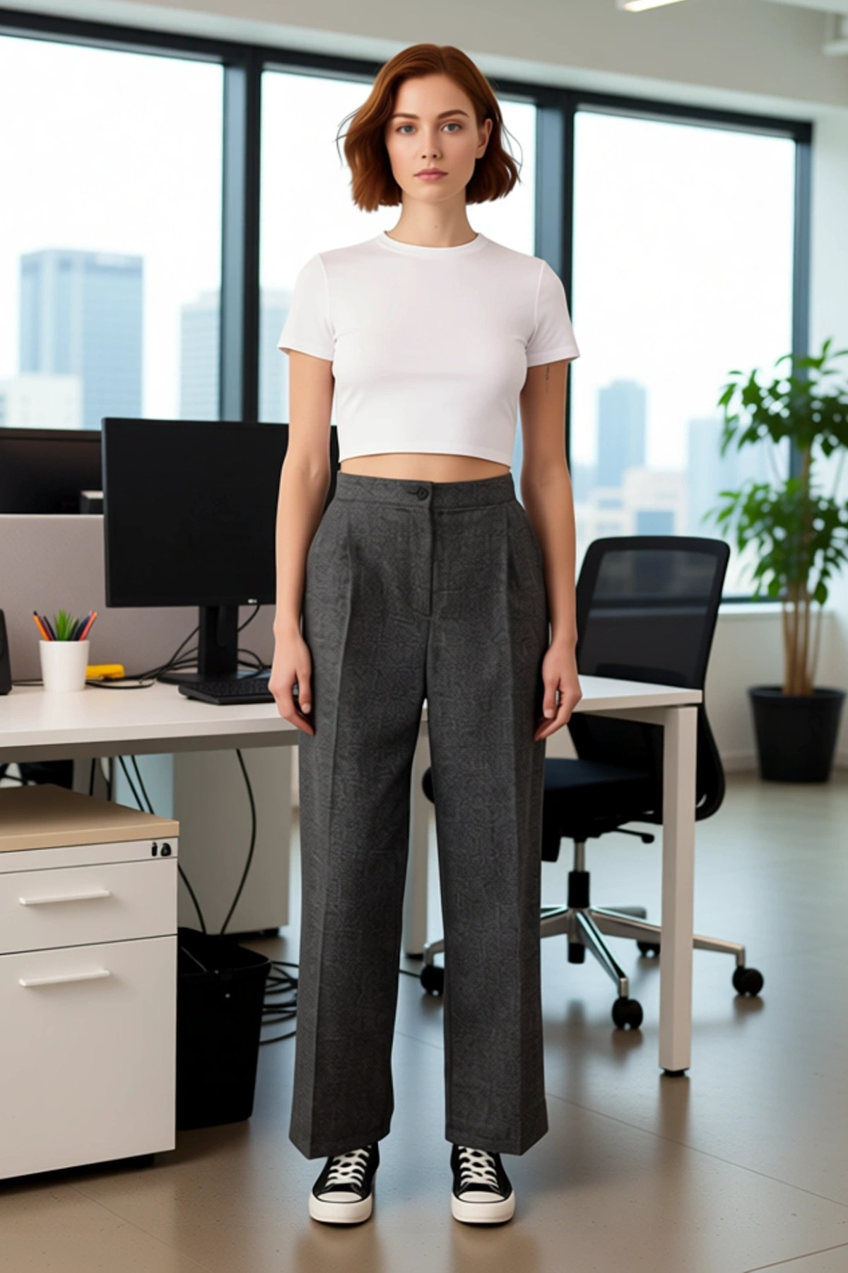 Bu antrasit renkli wide leg pantolon, kadın gardıroplarının temel parçalarından biri olmaya aday. Geniş paça kesimi, modern ve rahat bir silüet sunarken, kumaşın dokusu sofistike bir dokunuş katıyor. Pantolonun materyal bileşimi %52 viskoz, %46 polyester ve %2 elastan’dan oluşmaktadır. Bu karışım, hem nefes alabilirlik hem de esneklik sağlayarak gün boyu konfor sunar. Düz deseni sayesinde, farklı renk ve desenlerdeki üstlerle kolayca kombinlenebilir. Casual ve smart ortamlarda rahatlıkla kullanılabilecek bu pantolon, uzun boyu ile zarif bir duruş sergiler. Dokuma kumaş kalitesi, uzun ömürlü bir kullanım vadediyor. Bu pantolon, hem şık hem de pratik bir stil arayan kadınlar için ideal bir seçenektir. Pantolonun geniş paça kesimi, hareket özgürlüğü sağlarken aynı zamanda şık bir görünüm sunar. Normal bel detayı, vücuda oturan ve rahat bir his veren bir uyum sağlar. Kumaşın yumuşak dokusu, cilde dost bir his verir ve gün boyu rahatlık sunar. Pantolonun dikişleri ve detayları, özenli bir işçilikle tamamlanmıştır. Bu pantolon, hem günlük hayatta hem de daha özel davetlerde rahatlıkla tercih edilebilir. Geniş paça, bacakları daha uzun ve ince gösterme özelliğine sahiptir. Bu da pantolona ekstra bir estetik değer katar. Her detayıyla düşünülmüş bu pantolon, stil sahibi kadınların favorisi olacaktır. Bu pantolon, özellikle sonbahar ve kış aylarında tercih edilebilir. Beyaz bir gömlek ve topuklu ayakkabılarla ofis şıklığı yaratabilir, basic bir tişört ve spor ayakkabılarla ise rahat bir günlük stil oluşturabilirsiniz. Pantolonun bakımı için, kumaşın yapısını korumak adına düşük sıcaklıkta ve nazik deterjanlarla yıkama önerilir. Bu pantolon, hem şıklığı hem de konforu bir arada sunan çok yönlü bir parçadır.