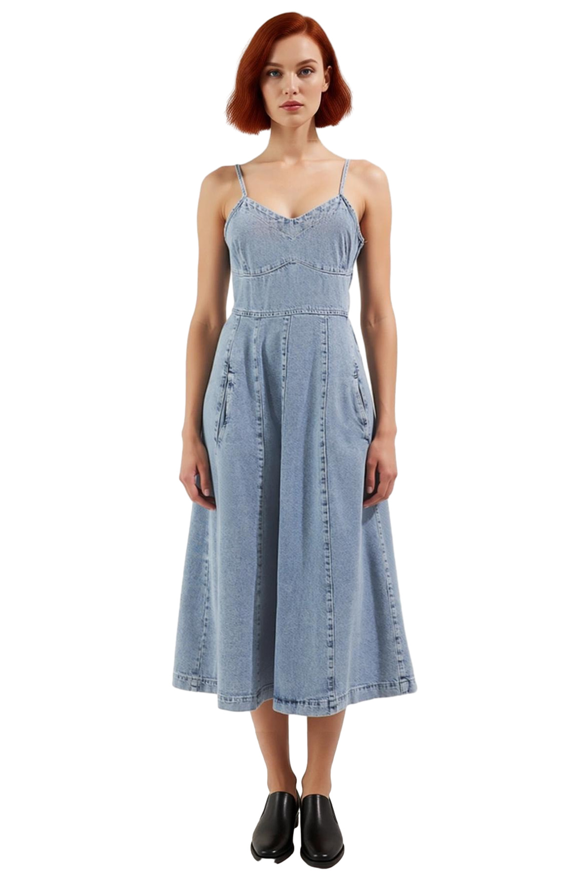 V yaka tasarımı, boyun bölgesine zarif bir açıklık katarken, askılı kol yapısı sıcak havalarda serin kalmanızı sağlar. Astarsız yapısı sayesinde hafif ve nefes alabilir bir kullanım sunan bu elbise, rigid dokuma denim kumaşı ile uzun ömürlü bir kalite vaat eder. Midi boyu, hem pratik hem de trend bir görünüm sunarak farklı ayakkabı stilleriyle uyum sağlar. Eteği fırfırlı detayı ile hareketli ve dinamik bir stil yaratırken, “Fashion Forward” ruhunuzu yansıtır. Kolay bakımı sayesinde yoğun tempolu günlerinizde bile pratik bir giyim alternatifi sunar; T18 yıkama talimatlarına uygun olarak makinede yıkanabilir.