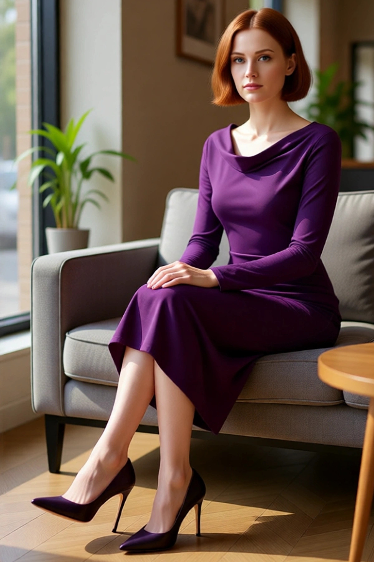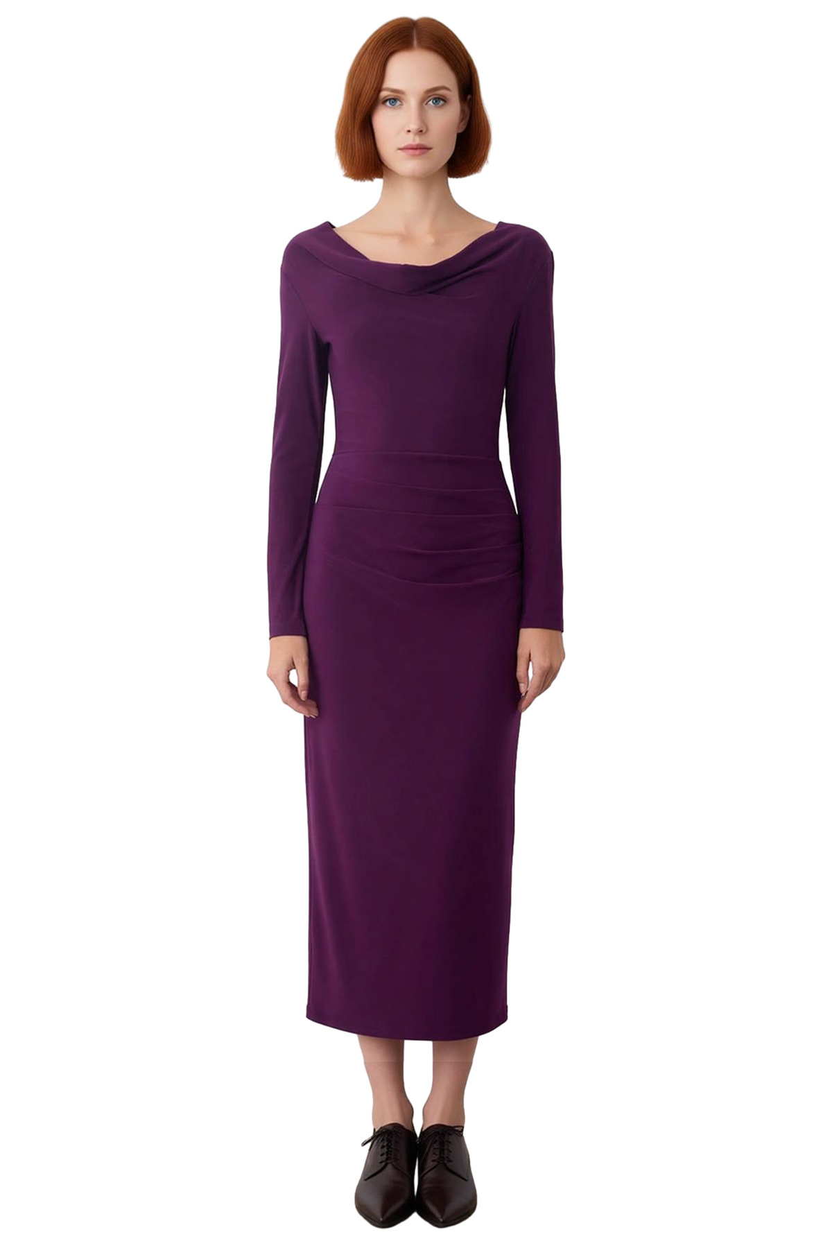 Ürün Özellikleri: Bodycon kalıp, polyester materyal, düz desen, degaje yaka, uzun standart kol, örme kalın sandy kumaş, mor renk, büzgü drape detay.