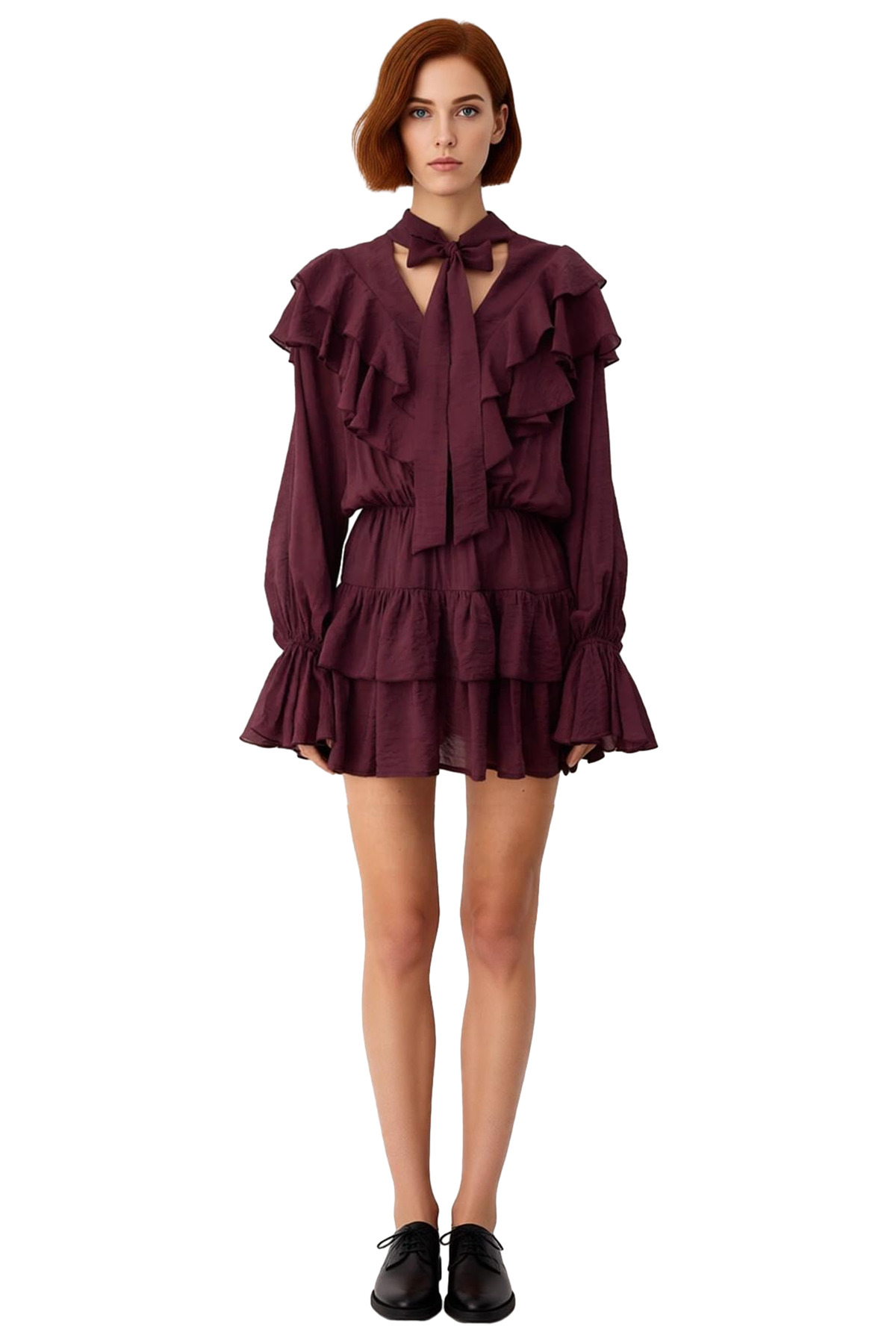 Ürün Özellikleri: Skater kalıp, %100 polyester materyal, düz desen, fular yaka, balon kol, dokuma şifon kumaş, bordo renk, astarlı tasarım.