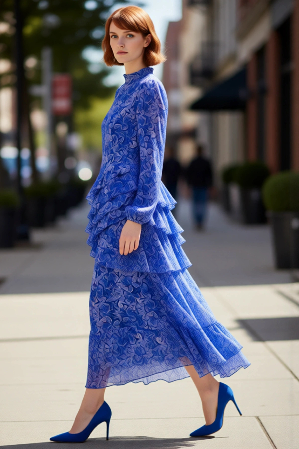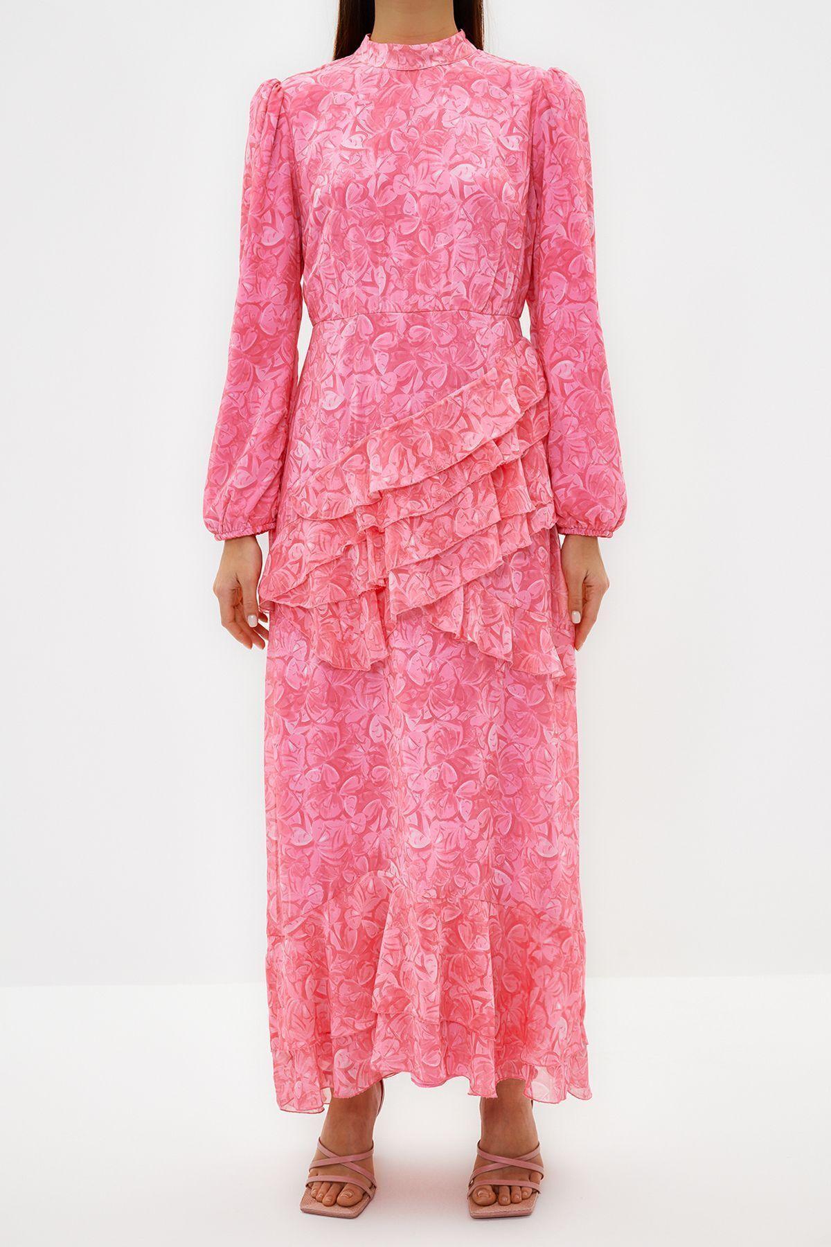 Kadın Astarlı Uzun Kollu Bisiklet Yaka Çiçek Desenli Maxi Eteği Fırfırlı Şifon Elbise, şıklığı ve konforu bir araya getiren göz alıcı bir tasarıma sahiptir. Canlı mavi çiçek deseniyle bahar ve yaz esintilerini taşıyan bu zarif parça, 100% polyester materyalden üretilmiş dokuma şifon kumaşıyla hafiflik ve akıcılık sunar. Skater kalıbı, belden itibaren genişleyerek eteği fırfırlı siluetle birleşerek feminen ve dinamik bir görünüm oluşturur. Astarlı yapısı sayesinde iç göstermez ve rahat bir kullanım deneyimi sunar.