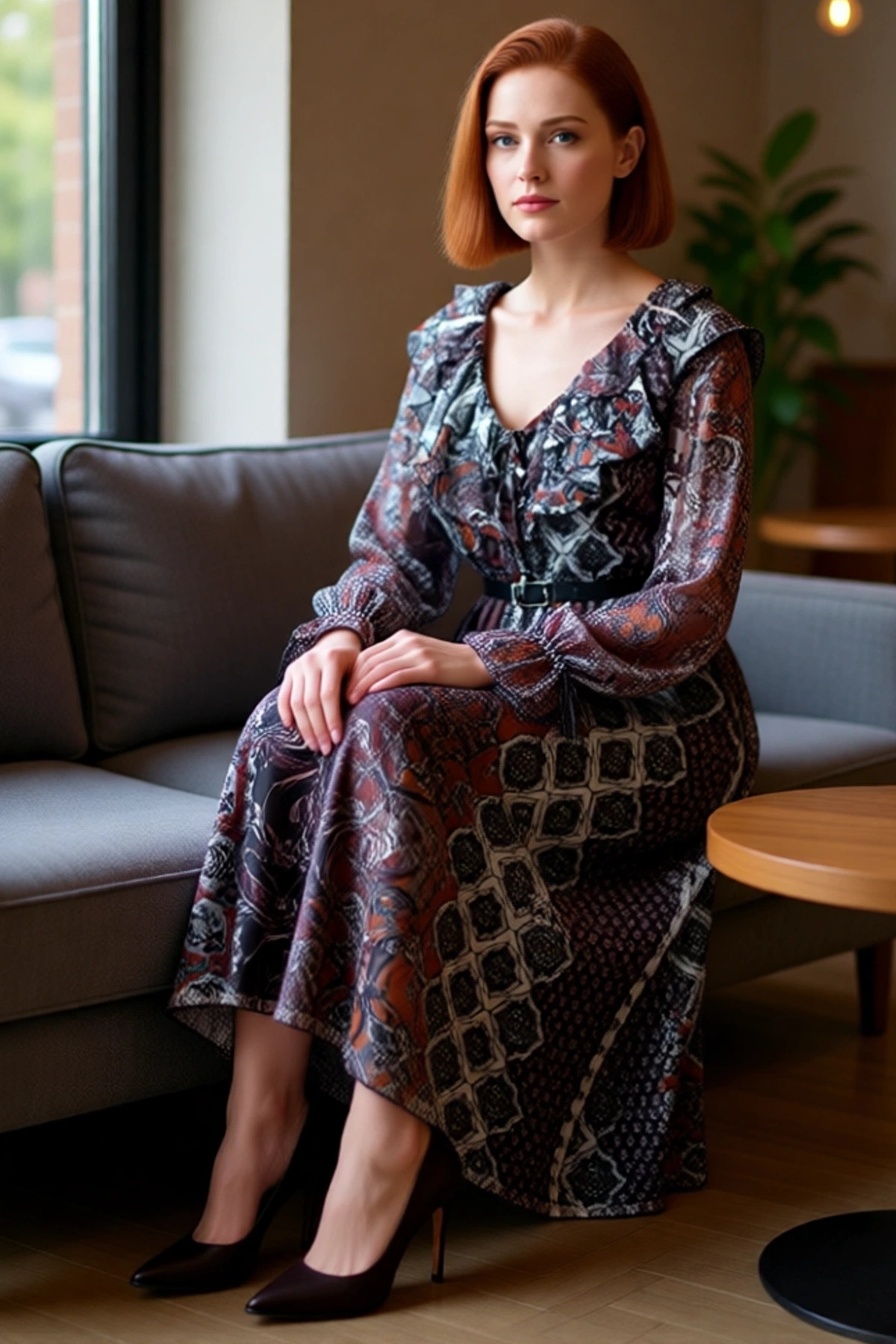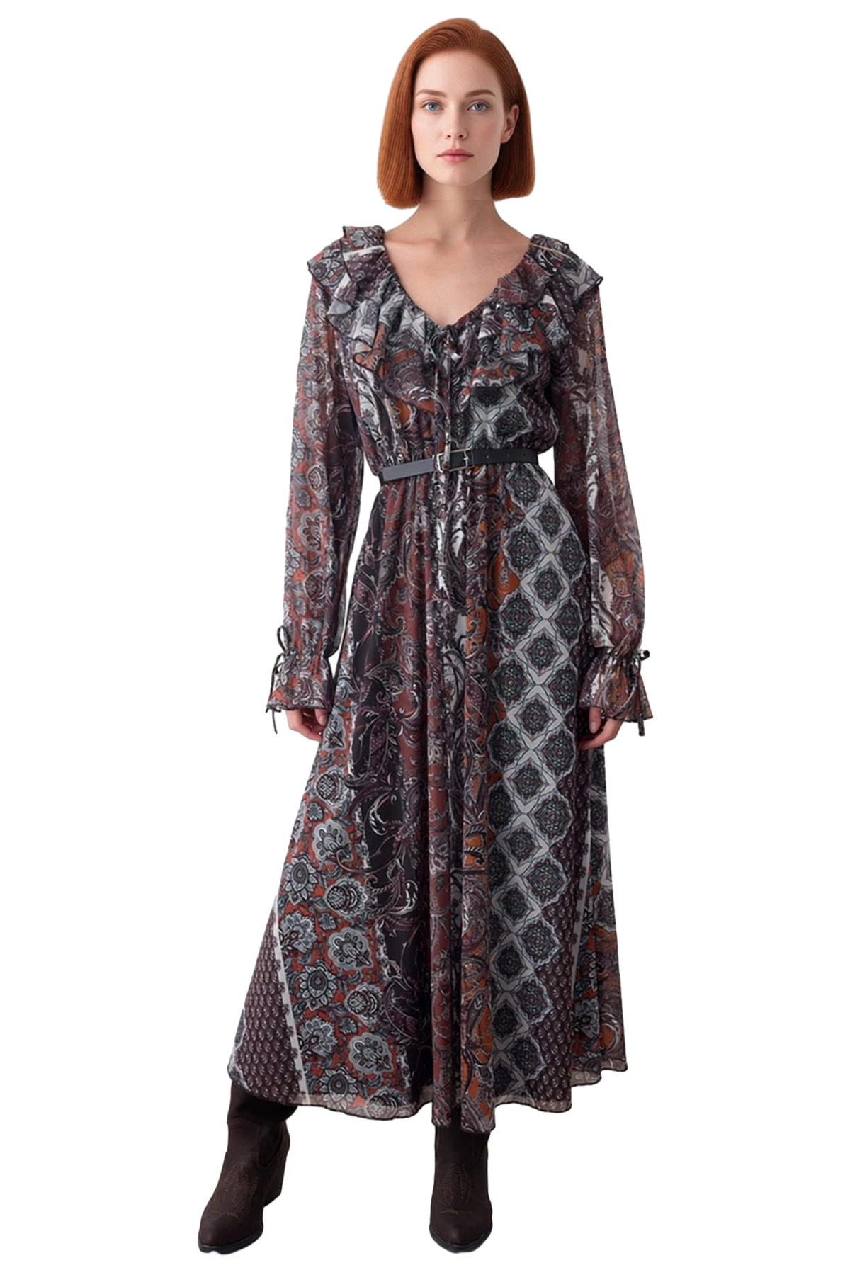 Ürün Özellikleri: Skater kalıp, %94 polyester %6 elastan materyal, şal desen, V yaka, balon kol, tül kumaş, çok renkli.