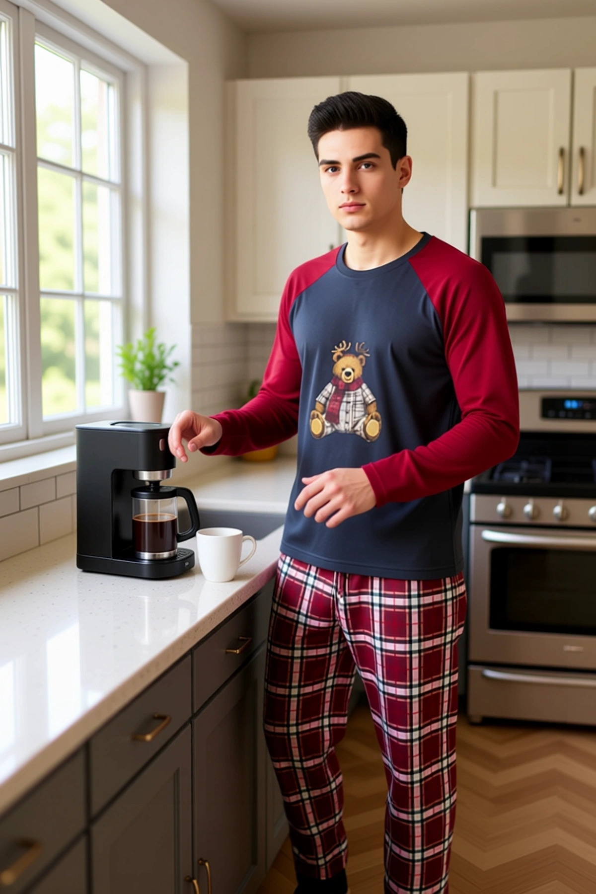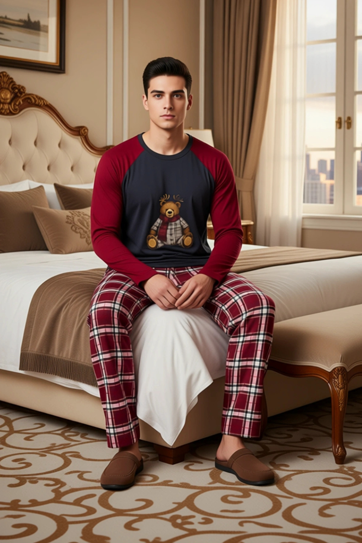Kadın Ayıcık Baskılı Ekose Pijama Takımı Fonksiyonel Dayanıklı Kaliteli Konforlu Estetik Şık