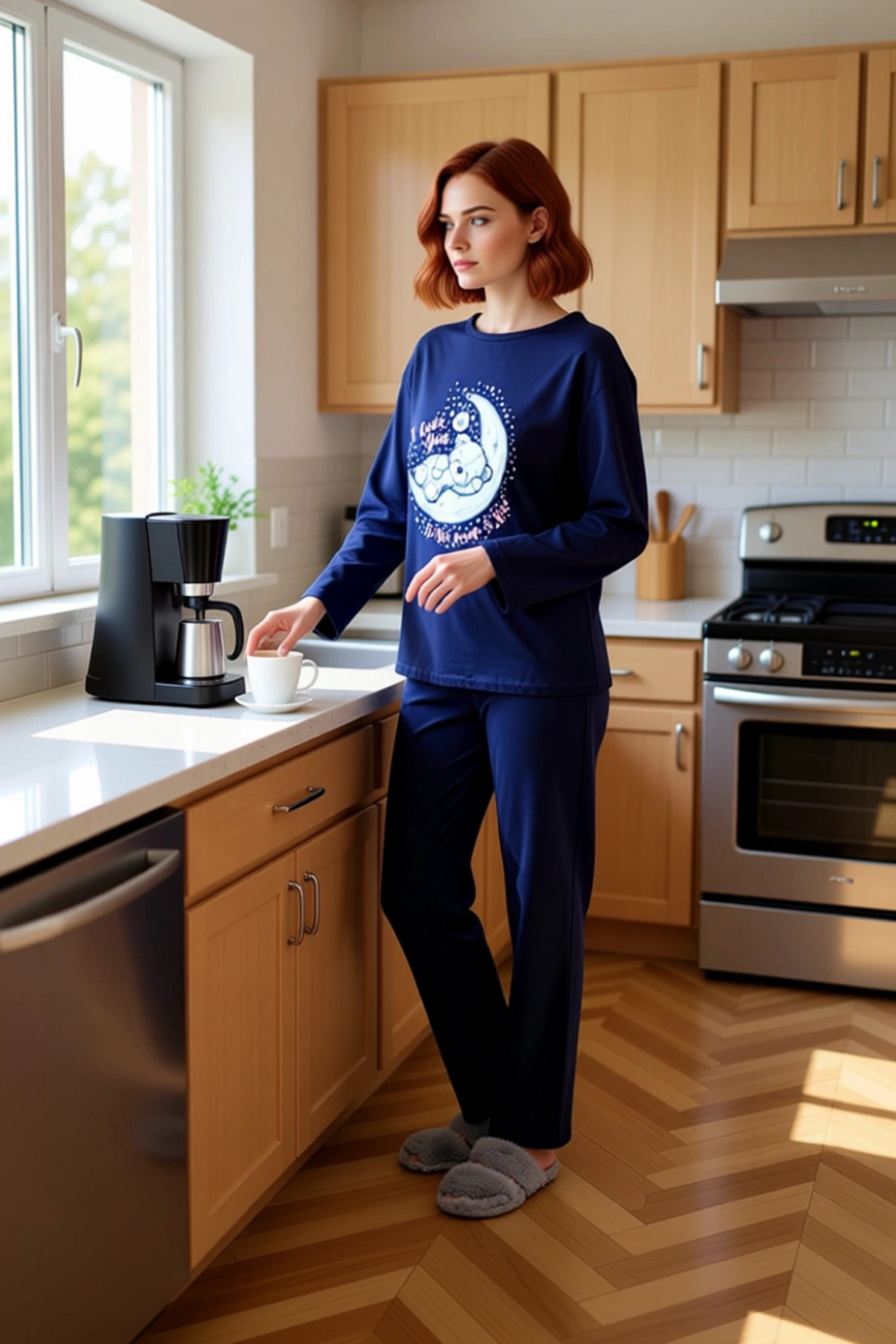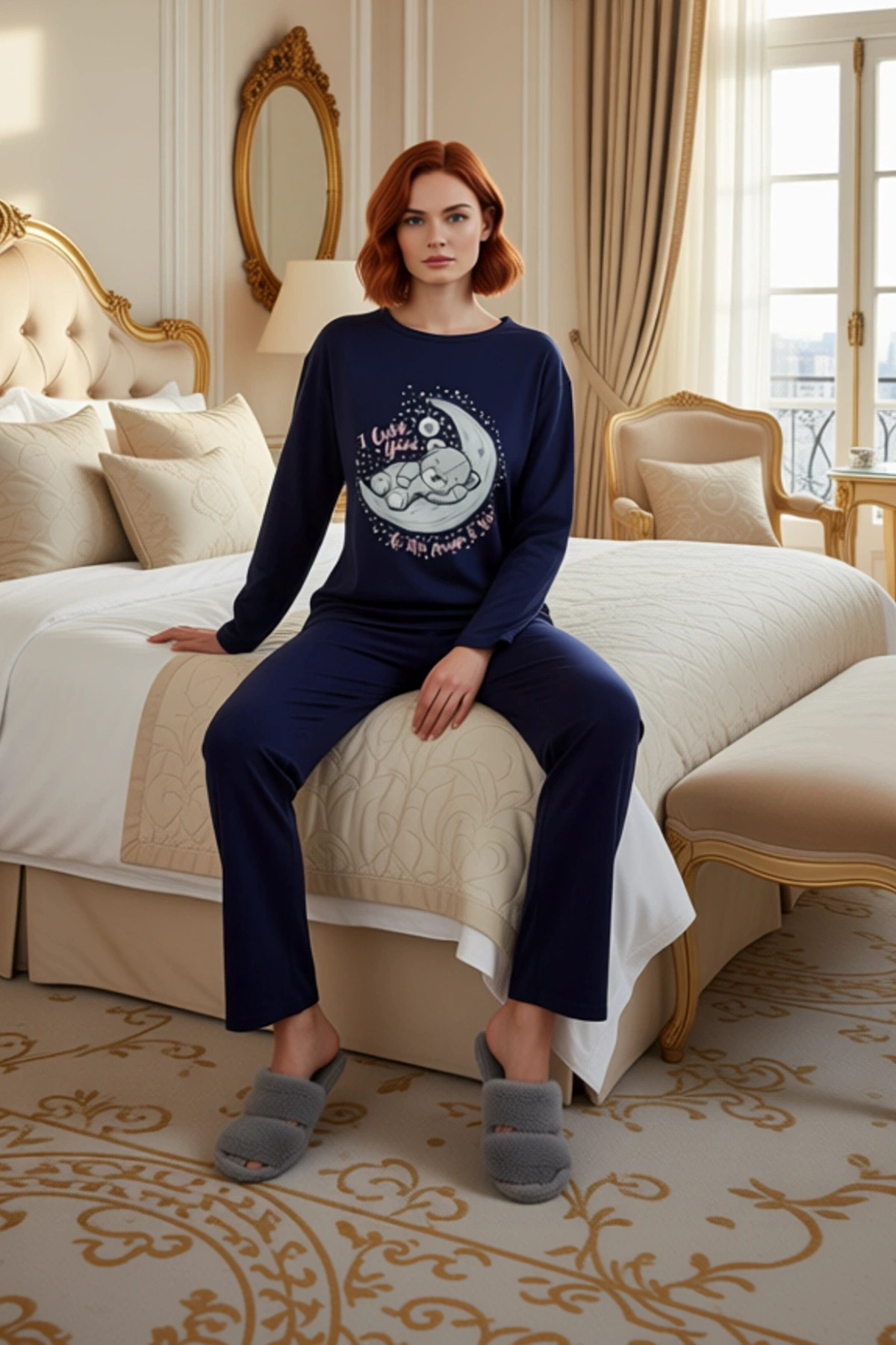 Kadınların evdeki rahat anları için özel olarak tasarlanmış bu lacivert pijama takımı, %100 pamuk kumaşı ile üstün bir konfor sunuyor. Yumuşak dokusu ve nefes alabilen yapısı sayesinde cildiniz gün boyu rahat kalır. Üzerindeki sevimli ayıcık ve galaksi temalı baskı, takıma eğlenceli ve modern bir dokunuş katıyor. Bu detay, özellikle genç ve enerjik bir stil arayan kadınlar için ideal. Takımın basic silueti ve regular kalıbı, her vücut tipine uyum sağlayarak rahat bir kullanım sunar. Örme kumaşın esnekliği, hareketlerinizi kısıtlamadan evdeki aktivitelerinize devam etmenizi sağlar. Lacivert rengin asaleti, baskının canlılığı ile birleşerek hem şık hem de kullanışlı bir ev giyim ürünü ortaya çıkarıyor. Bu takım, lounge ve ev ortamları için mükemmel bir seçimdir. Bu pijama takımının üst kısmında, rahat bir bisiklet yaka ve uzun kollu bir tasarım bulunuyor. Alt kısımda ise boru paça ve normal bel detaylarına sahip bir pantolon yer alıyor. Regular kalıbı, vücuda tam oturarak hem estetik bir görünüm sunar hem de hareket özgürlüğünü maksimize eder. Örme kumaşın yumuşaklığı, cildinizde ipeksi bir his bırakarak uyku kalitenizi artırır. Üstündeki ayıcık ve galaksi baskısı, parça baskı tekniğiyle canlı ve kalıcı bir şekilde uygulanmıştır. Bu takım, cool ve konforlu bir persona arayan kadınlar için biçilmiş kaftan. Evde geçirilen sakin zamanlarda veya dinlenme anlarında tercih edilebilir. Kumaşın kalitesi, gün boyu ferahlık ve rahatlık hissi verir. Kış mevsiminin soğuk günlerinde sizi sıcak tutacak bu pijama takımı, evdeki stilinizi tamamlayacak. Yumuşak ev terlikleri, rahat bir ev ayakkabısı veya şık bir sabahlıkla mükemmel bir uyum yakalar. Pantolonun düz kesimi, farklı ev üstleriyle de kolayca kombinlenebilir. Bakımı oldukça pratiktir; makinede yıkanabilir ve düşük ısıda ütülenebilir. Bu sayede pijama takımınızın ilk günkü kalitesini ve görünümünü uzun süre koruyabilirsiniz. Kendiniz için veya sevdikleriniz için düşünceli bir hediye seçeneği olacaktır.