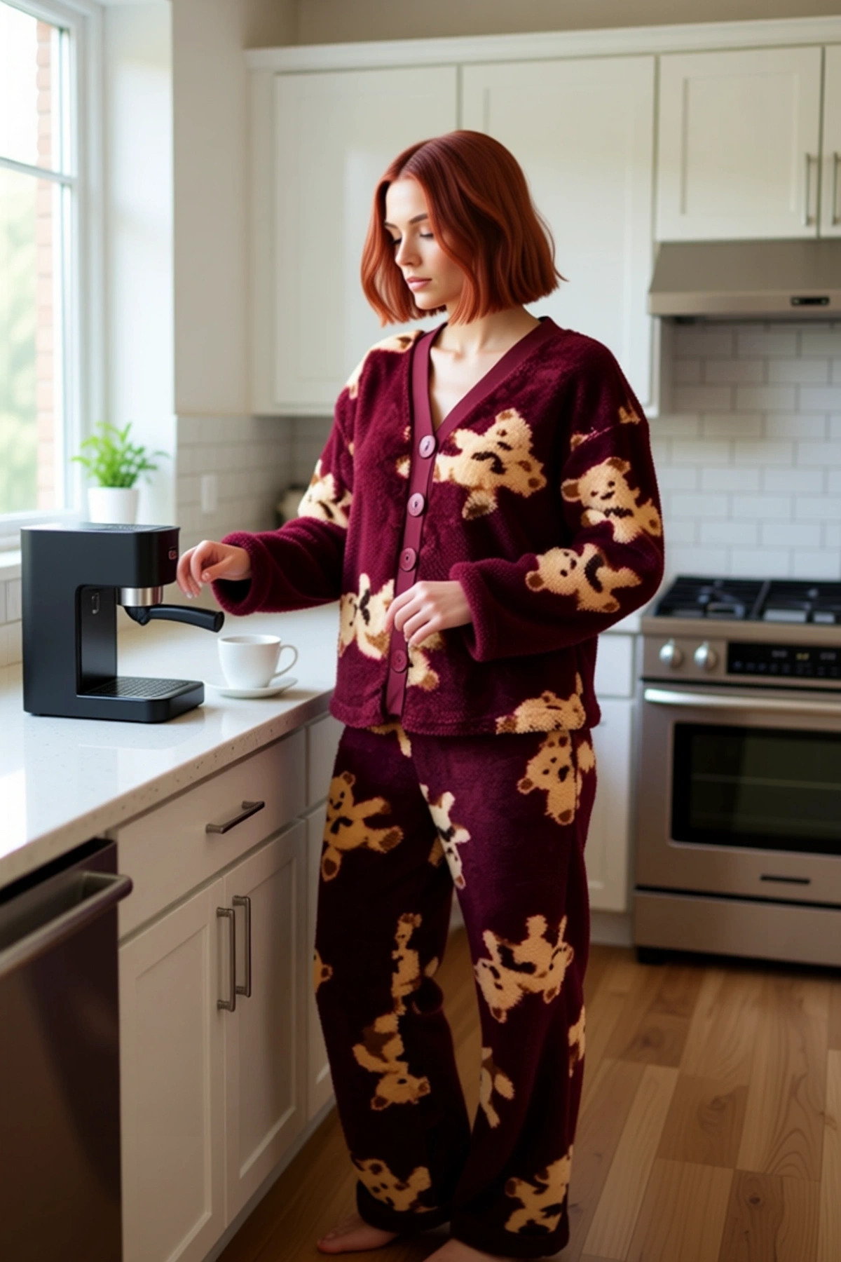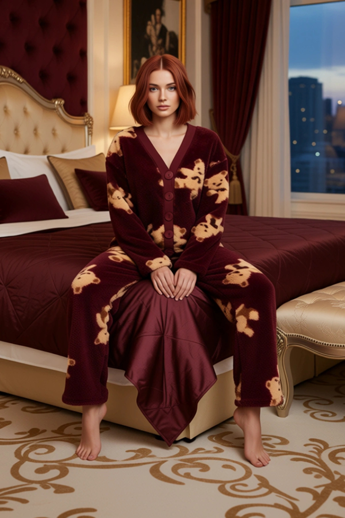Bu şık ve rahat kadın pijama takımı, %100 polyester wellsoft kumaştan üretilmiştir ve üzerinde yer alan sevimli ayıcık desenleri ile dikkat çekmektedir. Takımın yumuşak dokusu, kış aylarında evin içinde sıcak ve konforlu bir deneyim sunar. Regular kalıbı, her bedene uyum sağlayarak rahat bir kullanım vadeder. Düz kesimi ve geniş paçalı pantolonu, hareket özgürlüğünüzü kısıtlamadan gün boyu rahatlık sağlar. Bu pijama takımı, ev giyimi koleksiyonunuza eğlenceli bir dokunuş katarken, aynı zamanda stilinizden ödün vermemenizi sağlar. Animal desenleri, takıma dinamik bir görünüm kazandırır ve enerjik bir stil oluşturmanıza yardımcı olur. Bu ürün, evde geçirdiğiniz zamanları daha keyifli hale getirmek için tasarlanmıştır. Üst kısımda bulunan V yaka ve uzun kollu tasarım, hem şık hem de pratiktir. Düğmeli ön kısmı sayesinde kolayca giyip çıkarabilirsiniz. Pantolonun normal bel yapısı ve geniş paçaları, gün boyu süren bir konfor sunar. Wellsoft kumaşın eşsiz yumuşaklığı, cildinize nazikçe dokunarak kendinizi özel hissetmenizi sağlar. Bu pijama takımı, cool ve comfort persona ile uyumlu olup, lounge ve ev ortamları için idealdir. Basic silueti ve standart kol kesimi, her vücut tipine zarif bir şekilde uyum sağlar. Bu ürün, hem görsel estetiği hem de üst düzey konforu bir araya getirerek ev giyimi anlayışınızı yeniden tanımlar. Kış mevsiminin vazgeçilmez parçalarından biri olan bu pijama takımı, sizi sıcacık tutacaktır. Bu takımı, pelüş bir sabahlıkla, rahat bir ev ayakkabısı ve hatta kalın bir kazakla tamamlayarak kış temalı bir ev giyimi kombini oluşturabilirsiniz. Evde dinlenirken, film izlerken veya sevdiklerinizle vakit geçirirken bu takımı tercih edebilirsiniz. Bakımı oldukça pratiktir; makinede benzer renklerle yıkanabilir ve düşük ısıda kurutulabilir. Bu sayede pijama takımınızın canlılığını ve yumuşaklığını uzun süre koruyabilirsiniz. Bu ürün, kadınların evdeki rahatlığını ve stilini ön planda tutan bir seçenektir.