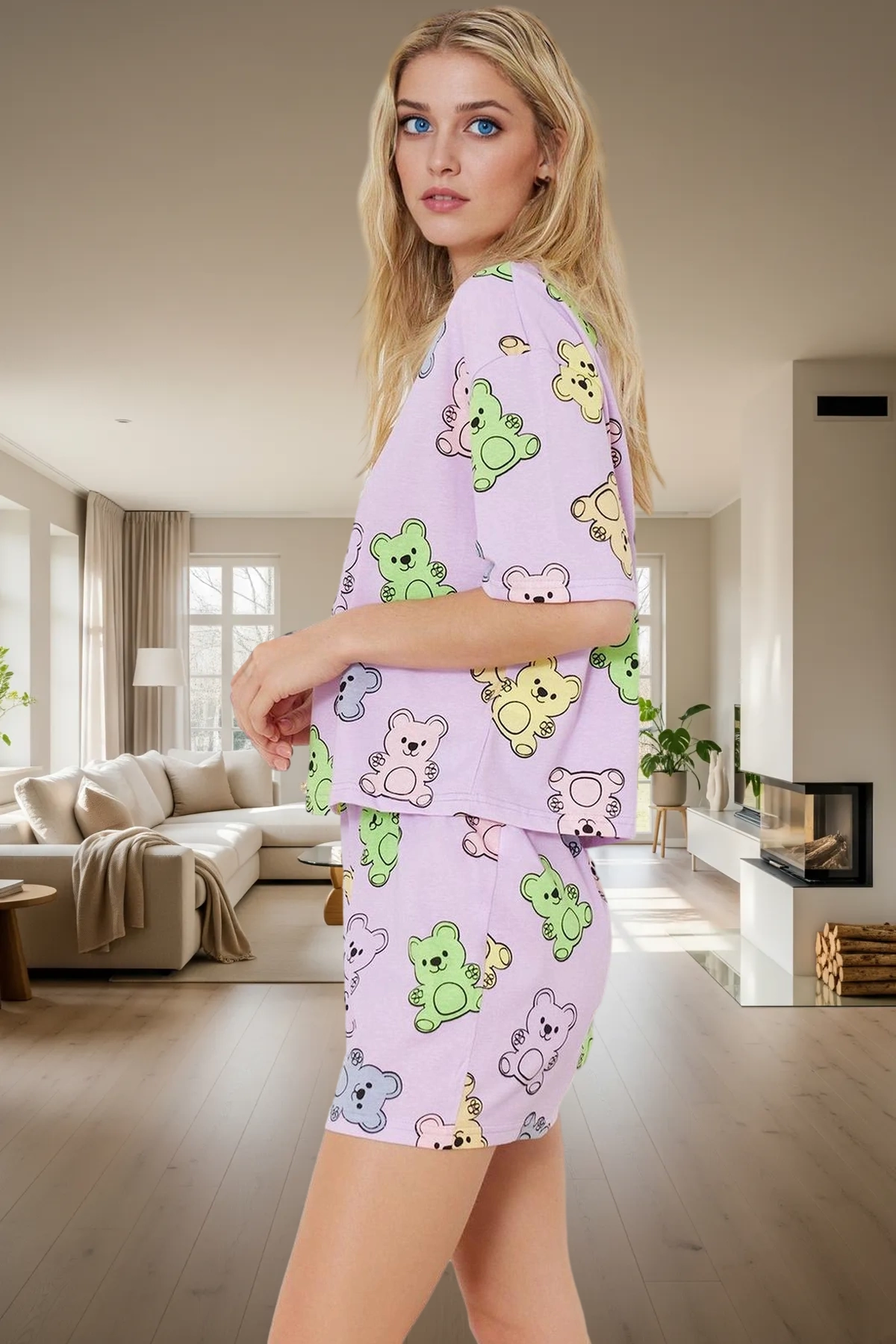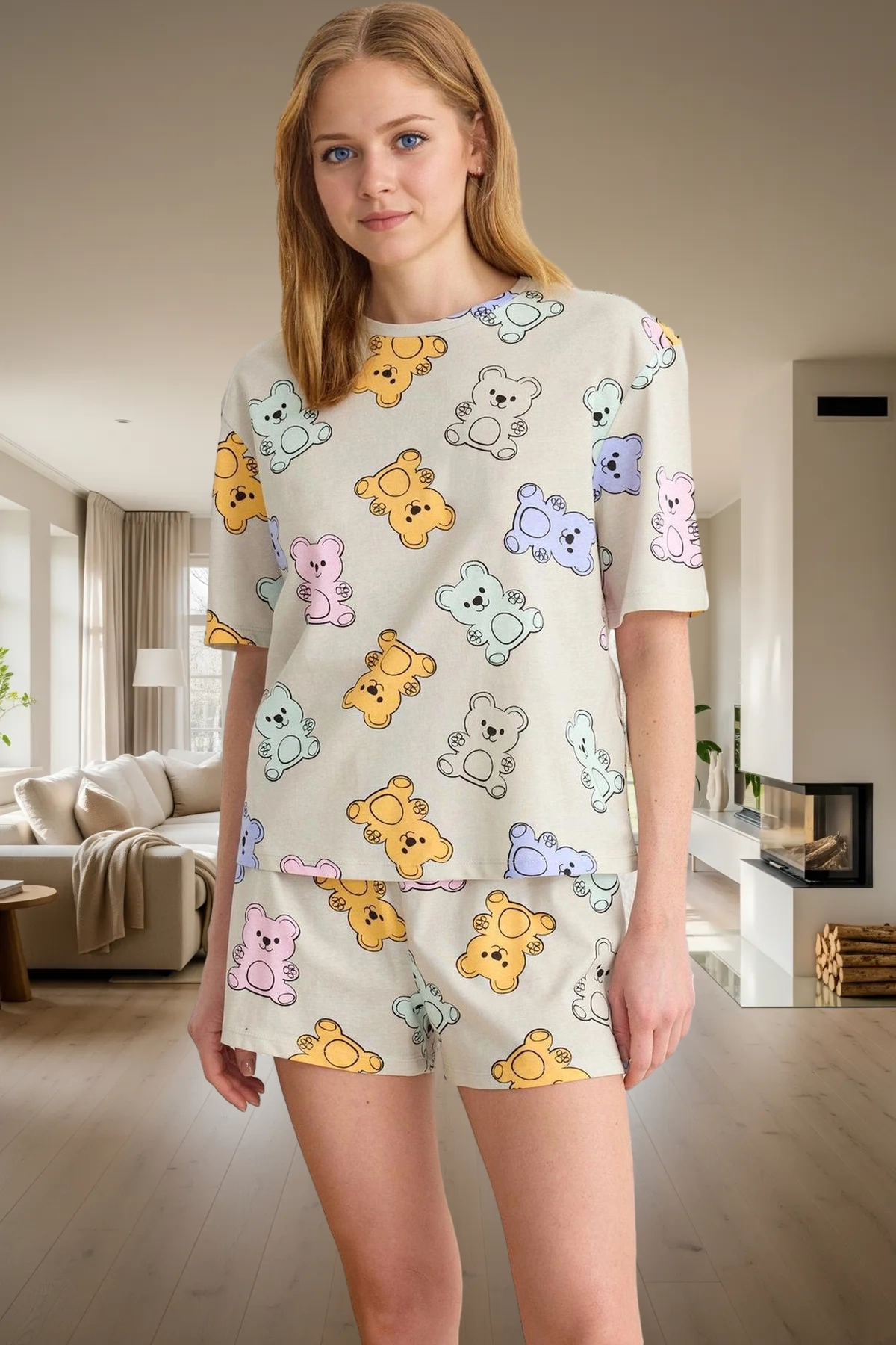 Kadın Ayıcıklı Pijama Takımı Bisiklet Yaka Kısa Kollu Şortlu Fonksiyonel Dayanıklı Estetik