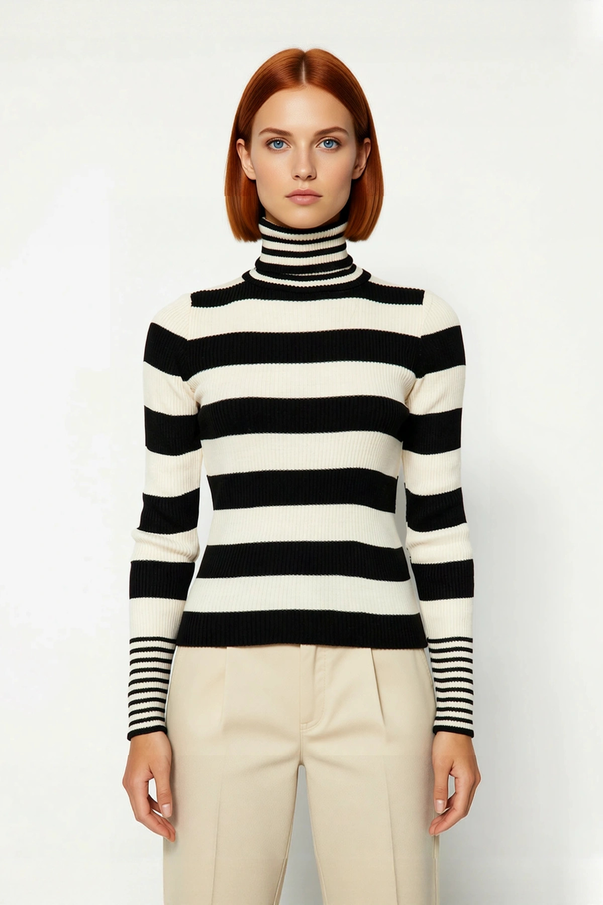 Ürün Özellikleri: Regular kalıp, %100 akrilik materyal, çizgili desen, balıkçı yaka, standart kol, triko kumaş, siyah-ekru renk, cepsiz tasarım.