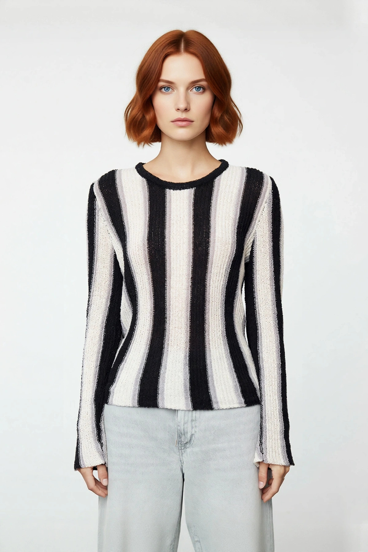 Bu Kadın Basic Bisiklet Yaka İnce Triko, günlük şıklığınızı tamamlamak üzere tasarlandı. Regular kalıbı sayesinde vücuda tam oturmayan, rahat ve salaş bir duruş sunar. %68 pamuk ve %32 polyester karışımı materyali, teninize nazik dokunuşlar yaparak gün boyu maksimum konfor sağlar. Siyah, gri ve krem tonlarındaki belirgin renk bloklu deseni, modern ve çekici bir estetik yaratırken, baskısız yüzeyi sade ve minimalist bir stilin kapılarını aralar. İlkbahar ve sonbahar mevsimlerinin serin havaları için ideal olan bu kazak, Casual/Günlük kullanım için vazgeçilmez bir parçadır. İnce yapısı sayesinde katmanlı giyime de oldukça uygundur.