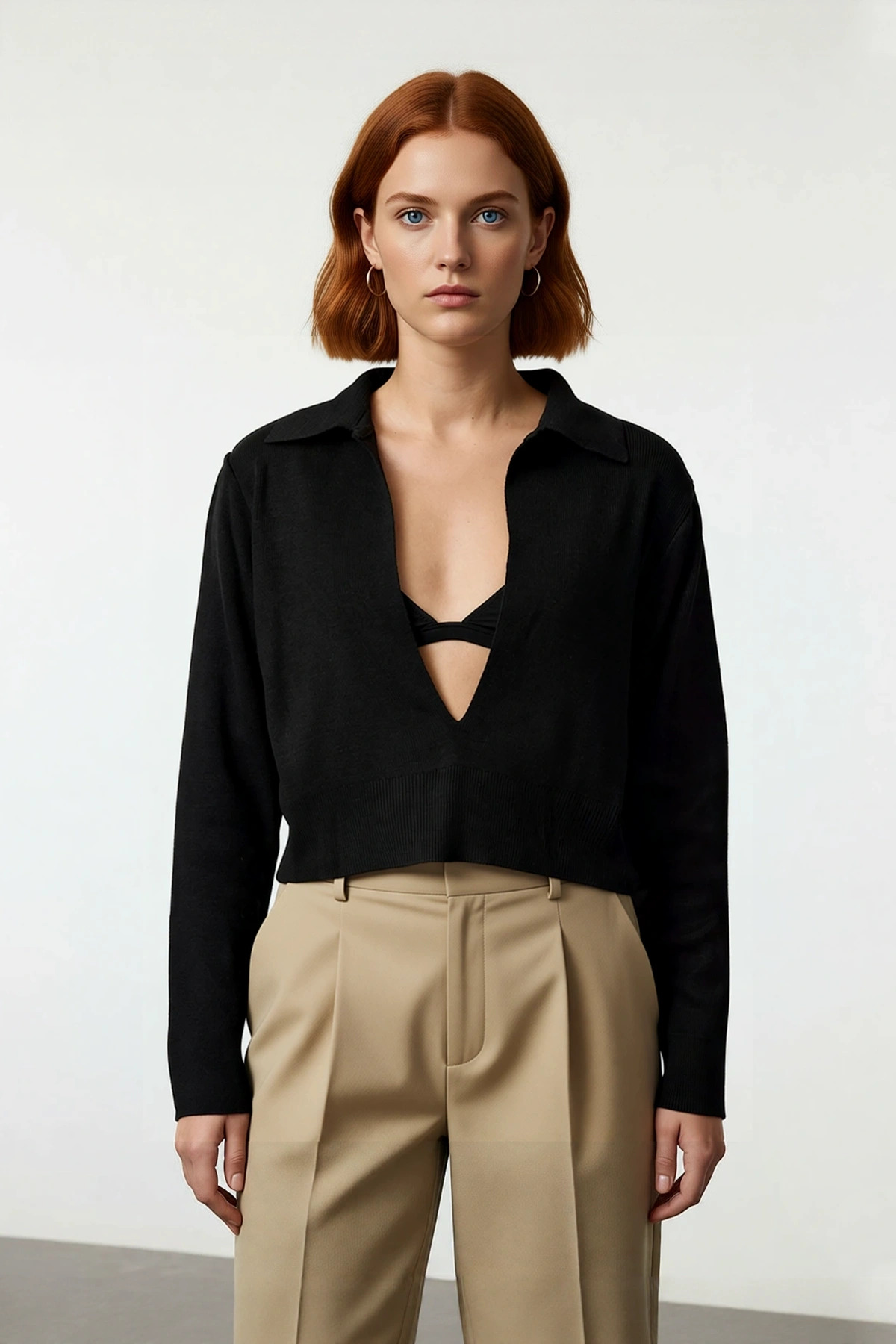 Polo yaka tasarımı, derin V yaka kesimiyle feminen ve sofistike bir hava katarken, standart uzun kolları konforlu bir kullanım deneyimi sağlar. Triko kumaşın hafif ve nefes alabilen yapısı, cildinizin gün boyu rahat etmesine olanak tanır. Cepsiz ve kemersiz oluşu, sade ve minimalist bir siluet yaratır, bu da kazak modelini farklı stillere kolayca adapte edilebilir kılar. Tek plaka dokuma tekniği, ürünün formunu uzun süre korumasını ve dayanıklılığını artırmasını sağlar. Gündüz casual kombinlerden, gece şık davetlere kadar geniş bir kullanım yelpazesi sunan bu “Fashion Forward” parça, T41 yıkama talimatlarına uygun olarak makinede kolayca temizlenebilir.