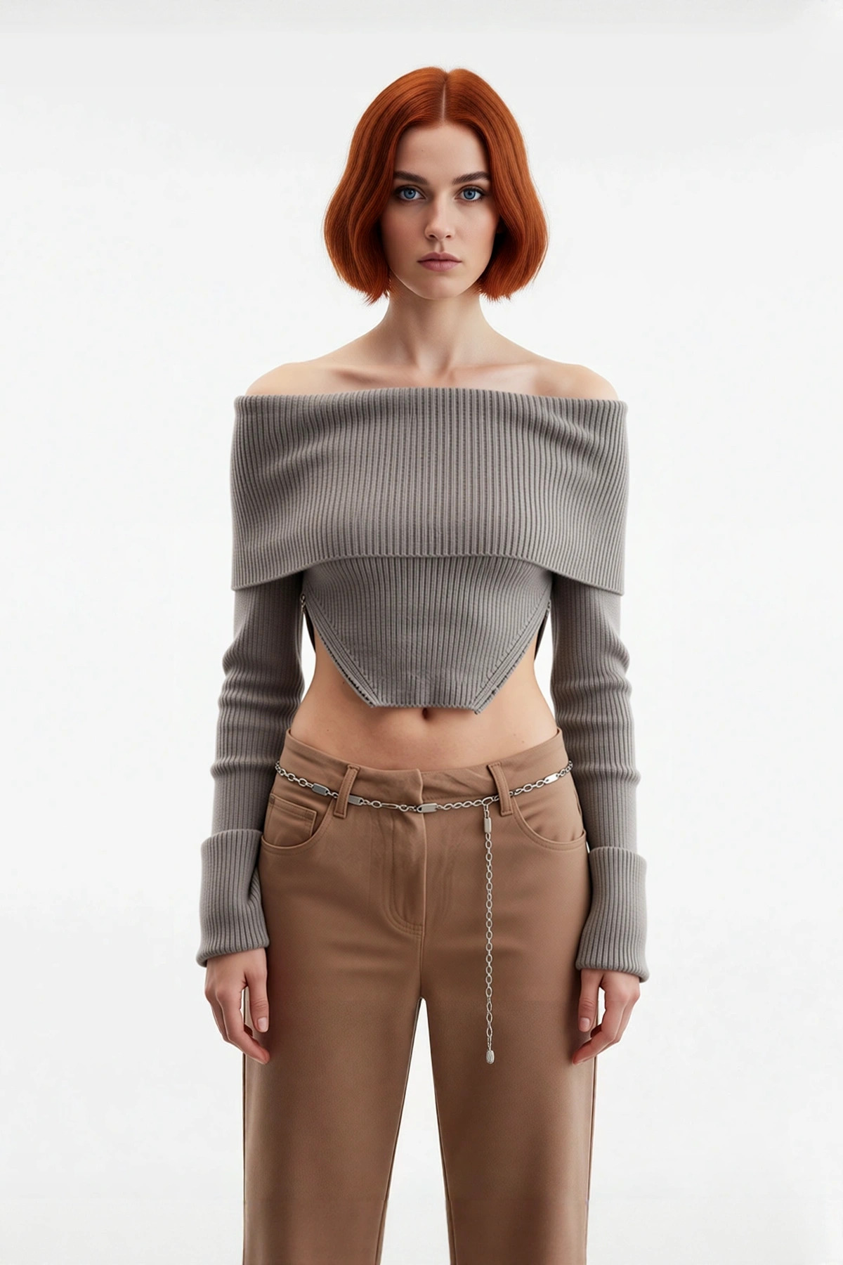 Kadın Basic Fitilli Triko Kazak Carmen Yaka Ve Super Crop Kesimiyle Modern Şıklık Sunar Kaliteli