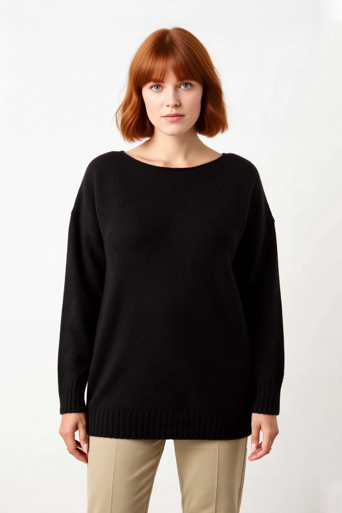 Ürün Özellikleri: Regular kalıp, 75% Akrilik 25% Polyester materyal, düz desen, kayık yaka, standart kol, triko kumaş, siyah renk.