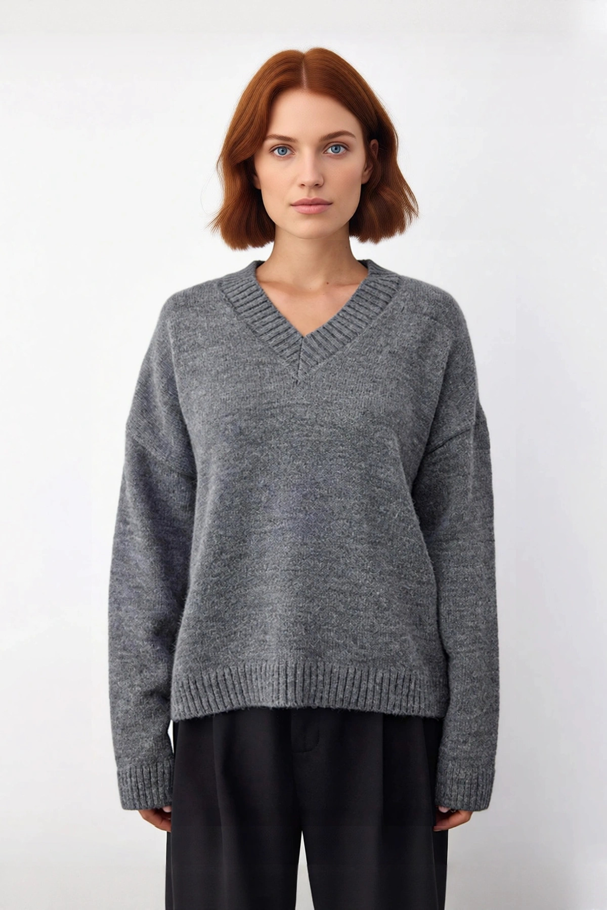Ürün Özellikleri: Geniş kalıp, akrilik materyal karışımı, düz desen, V yaka, standart kol, triko kumaş, gri renk, baskısız tasarım.
