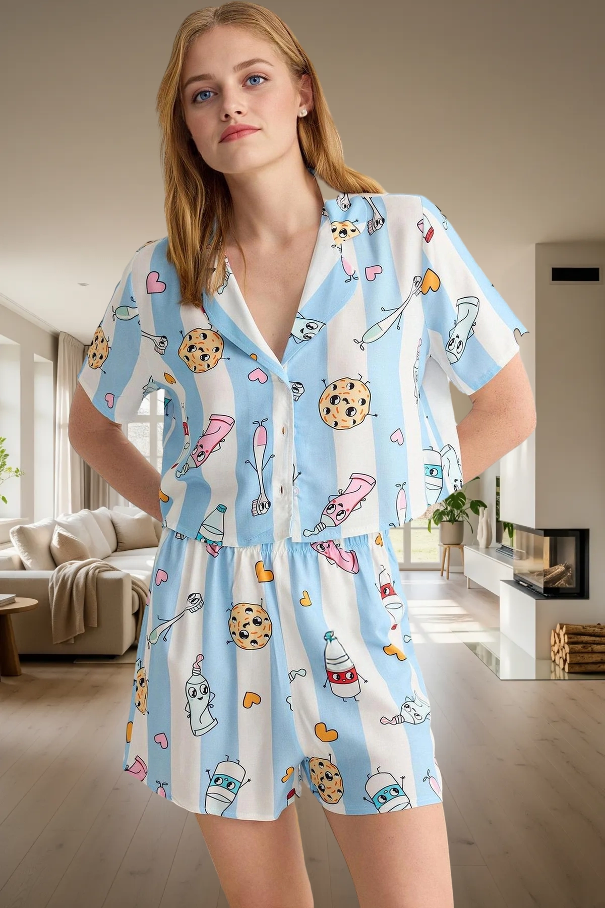 Kadın Baskılı Viskon Gömlek Şort Pijama Takımı Fonksiyonel Dayanıklı Kaliteli Konforlu Şık