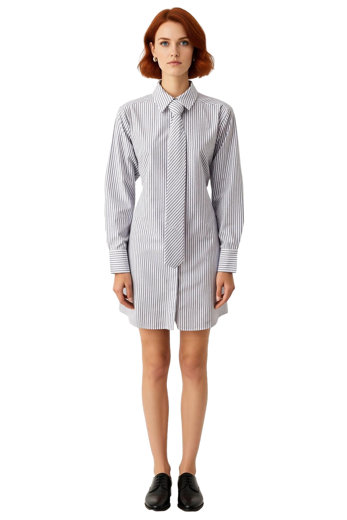 Elbisenin çizgili deseni, dinamik ve enerjik bir hava katarken, beyaz ve gri renklerin uyumu klasik bir şıklık sunar. Gömlek elbise kalıbı, vücuda nazikçe oturan bir kesime sahiptir, bu da onu hem gündüz hem de gece kombinleri için uygun hale getirir. Casual ve günlük ortamlarda şıklığınızı ön plana çıkaracak bu elbise, moda trendlerini takip eden kadınlar için idealdir. Terrycotton dokuma tipi, kumaşa yumuşak bir dokunuş kazandırır ve kullanım sırasında ekstra rahatlık sağlar.