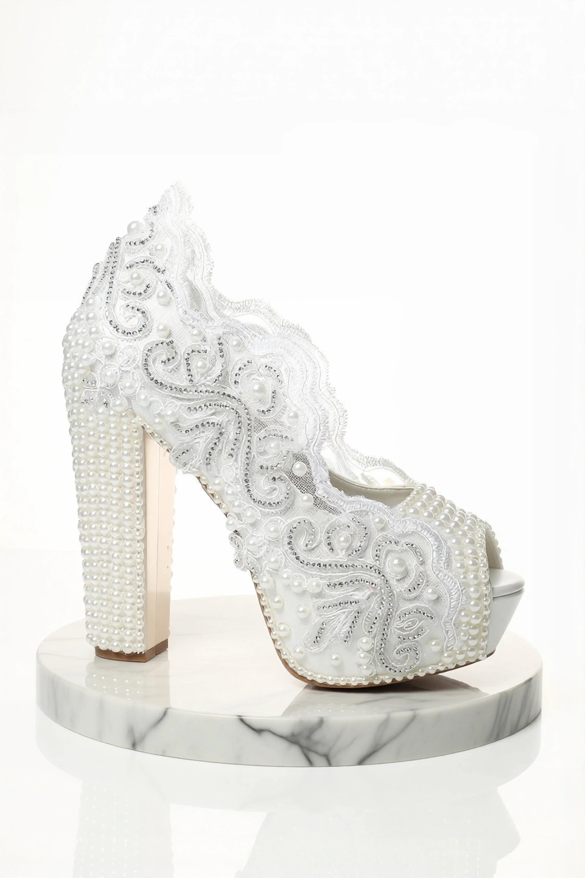 Zarif tasarımıyla dikkat çeken bu gelin ayakkabısı, yüksek topuklu (10 cm ve üzeri) yapısıyla şıklığınızı tamamlar.