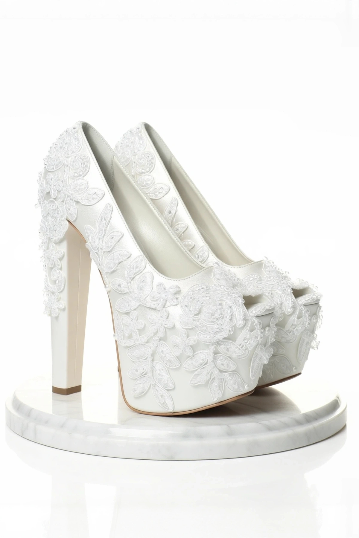 Zarif tasarımıyla dikkat çeken bu gelin ayakkabısı, yüksek topuklu (10 cm ve üzeri) yapısıyla şıklığınızı tamamlar.