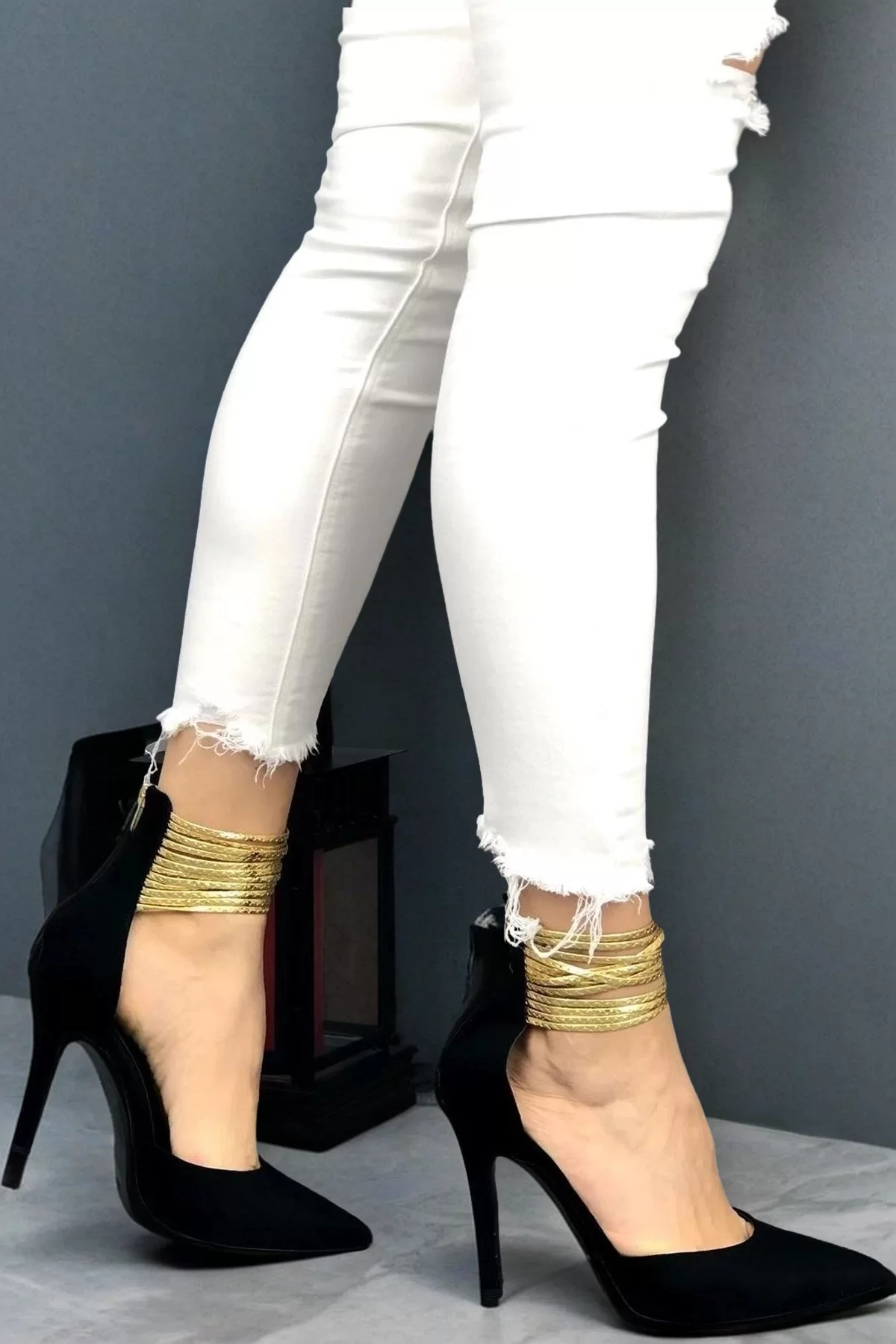 Modern stilin simgesi haline gelen bu ayakkabı altın bilek halkası detayıyla klasik şıklığa güçlü bir yorum getirir Mat ve kadifemsi yüzeyiyle feminenliğin en yumuşak halini sunarken ince topuğu ve sivri burun formu her adımda zarif bir duruş sergiler Işıltılı ama zarif olmayı seven kadınların dolabında mutlaka yer almalı