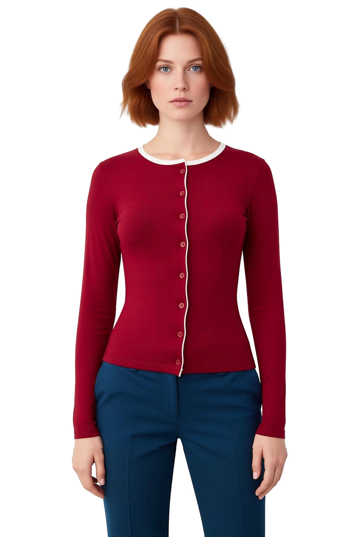 Bu kadın bluzu, modern ve şık bir görünüm sunarken aynı zamanda üst düzey konfor sağlar. Bisiklet yaka detayı, zarif bir görünüm katarken, tam düğme kapama özelliği kullanım kolaylığı sunar. Standart kesimi ve uzun kollu tasarımı, her vücut tipine uyum sağlayarak rahat bir kullanım deneyimi sunar. Viskon ribana kumaşından üretilmiş olması, bluzun yumuşaklığını ve esnekliğini artırarak vücuda nazikçe oturmasını sağlar. Düz deseni, minimalist bir estetik sunarak farklı kıyafetlerle kolayca kombinlenmesini mümkün kılar. Bu örme bluz, özellikle kış aylarında sıcak tutma özelliği ile öne çıkar. Casual ve günlük kullanım için idealdir, kot pantolonlar, etekler veya taytlarla mükemmel bir uyum yakalar. Ürün detayı olarak biyeli kenarları, şık bir dokunuş ekler. %100 viskoz materyal bileşeni, nefes alabilirlik ve ipeksi bir his sunarak gün boyu rahatlık sağlar. Türkiye’de üretilmiş olan bu bluz, kalitesi ve işçiliği ile dikkat çeker. Yıkama talimatlarına uyulduğunda uzun yıllar boyunca ilk günkü gibi kalacaktır. Bu bluz, hem rahatlığı hem de şıklığı bir arada arayan her kadın için mükemmel bir tercihtir. Günlük yaşamın temposunda veya özel davetlerde, bu bluz ile kendinizi güvende ve şık hissedeceksiniz. Modern tasarımı ve kaliteli malzemesiyle öne çıkan bu ürün, her kadının gardırobunda bulunması gereken temel parçalardan biridir. Farklı aksesuarlarla kolayca kişiselleştirilebilir ve her tarza uyum sağlayabilir. Bu bluz, zamansız bir şıklık ve maksimum konfor sunar.