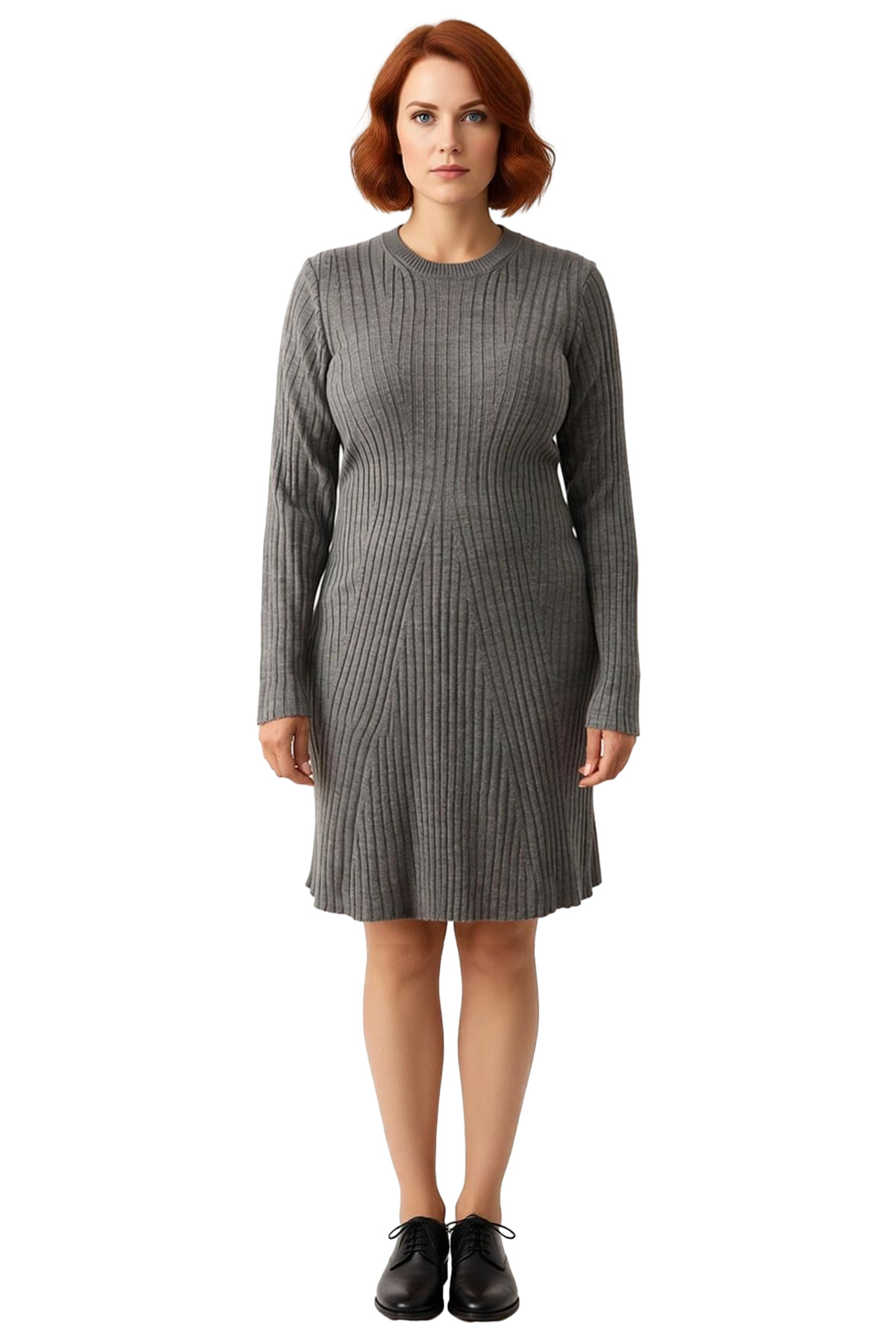 Ürün Özellikleri: Bodycon kalıp, akrilik materyal, düz desen, bisiklet yaka, standart kol, triko kumaş, gri renk.