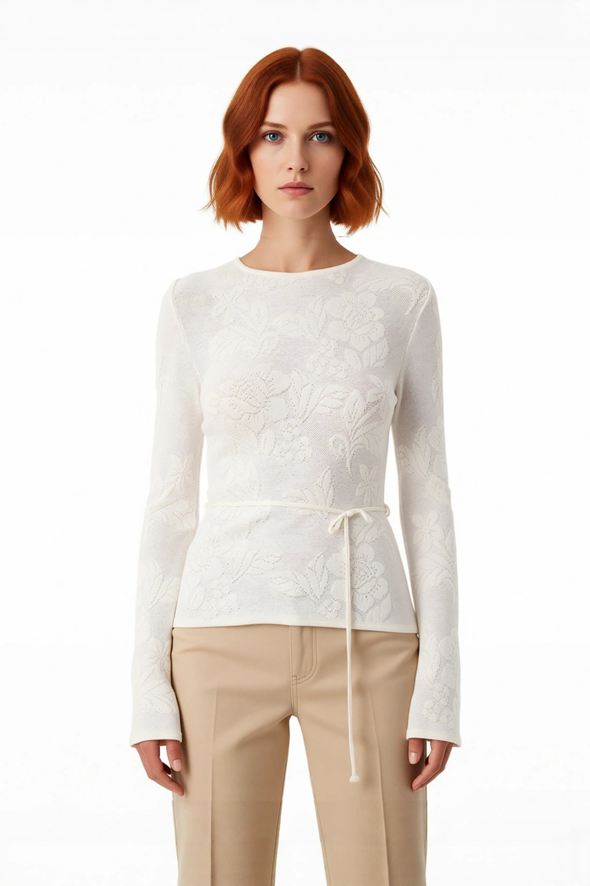 Ürün Özellikleri: Fitted kalıp, 73% viskoz 27% polyester materyal, çiçekli desen, bisiklet yaka, standart kol, triko kumaş, ekru renk, bağlamalı bel detayı.