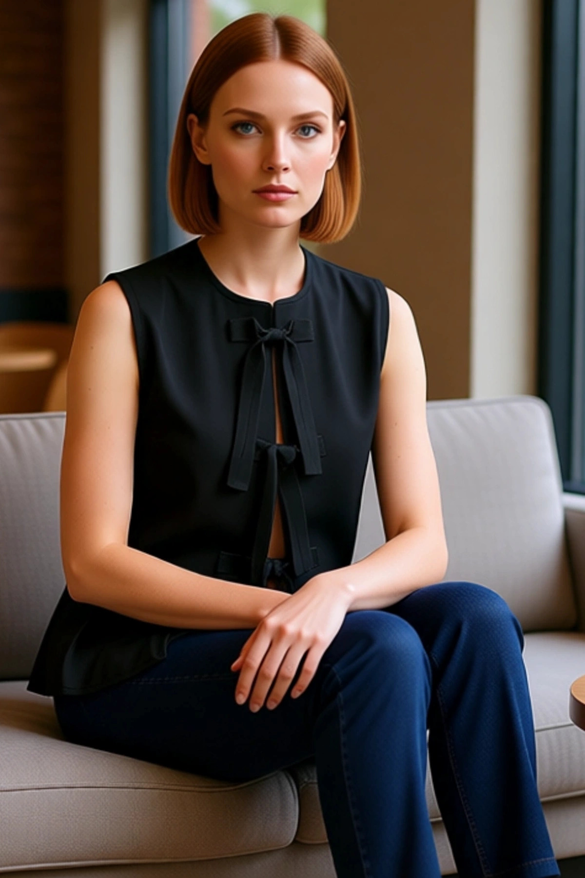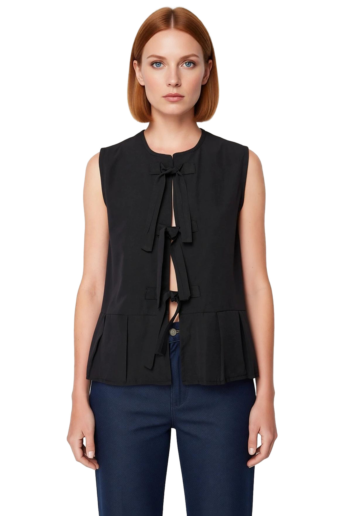 Bu zarif kadın bluzu, regular kalıbı ve basic silueti ile her vücut tipine uyum sağlayarak rahat bir kullanım sunar. %70 pamuk ve %30 polyesterden oluşan pamuk polyester karışımlı dokuma kumaşı, hem nefes alabilir hem de uzun ömürlüdür. Düz deseni ve zamansız siyah rengi ile dikkat çeken bu bluz, önündeki fiyonk bağcık detayları ve modern bisiklet yaka tasarımıyla stilinize farklı bir boyut katacaktır. Kolsuz yapısı, özellikle sıcak havalarda ferah bir deneyim yaşatır. Terrycotton dokuma tipi, kumaşa yumuşak bir dokunuş kazandırır. Astar içermeyen ve cep bulunmayan tasarımı, ürünün hafifliğini ve sadeliğini pekiştirir. Uzun boyu, ister pantolon ister etekle kombinlendiğinde şık bir görünüm oluşturur. Fashion Forward bir duruş sergileyen bu bluz, günlük ve casual ortamlarda stilinizi öne çıkaracaktır.Ürünün ön kısmındaki zarif fiyonk bağlama detayı, bluzun genel görünümüne feminen bir hava katarken, bisiklet yaka kesimi klasik bir şıklık sunar. Standart kol kesimi, günlük aktiviteler sırasında özgürce hareket etmenizi sağlar. Dokuma kumaşın kalitesi, ürünün dayanıklılığını artırarak uzun yıllar gardırobunuzda yer etmesini garantiler. Terrycotton dokuma, cildinize nazik davranarak gün boyu konforlu hissetmenizi sağlar. Bu bluz, hem estetik görünümü hem de pratik kullanımı ile öne çıkar. Kemer veya kuşak gibi ek detaylar içermeyen sade tasarımı, farklı aksesuarlarla kişiselleştirmeye olanak tanır. Sürdürülebilirlik konusunda belirgin bir detayı olmamakla birlikte, ürünün kalitesi ve tasarımı ön plandadır. Yıkama talimatı Hassas Yıkama olarak belirtilmiştir, bu da kolay bakım imkanı sunar.Bu kolsuz bluz, yaz sezonu için mükemmel bir seçenektir. Yüksek bel kot pantolonlar, keten şortlar veya midi eteklerle harika kombinler oluşturabilirsiniz. Casual ve günlük kullanım için ideal olan bu ürün, şehir hayatının temposuna ayak uyduracak şekilde tasarlanmıştır. Fashion Forward stil anlayışına sahip kullanıcılar için tasarlanan bluz, hem şık hem de rahat bir görünüm sunar. İster gündüz ister akşam kullanılabilecek bu parça, gardırobunuzda çok yönlü bir rol üstlenecektir. Ürünün menşei Türkiye’dir.Ürün Özellikleri: Regular kalıp, pamuk polyester materyal, düz desen, bisiklet yaka, standart kol, dokuma kumaş, siyah renk, cepsiz, astarsız, kolsuz, casual kullanım, basic siluet, terrycotton dokuma, fashion forward persona, kemersiz, Hassas Yıkama yıkama, yaz sezonu, Türkiye menşei.