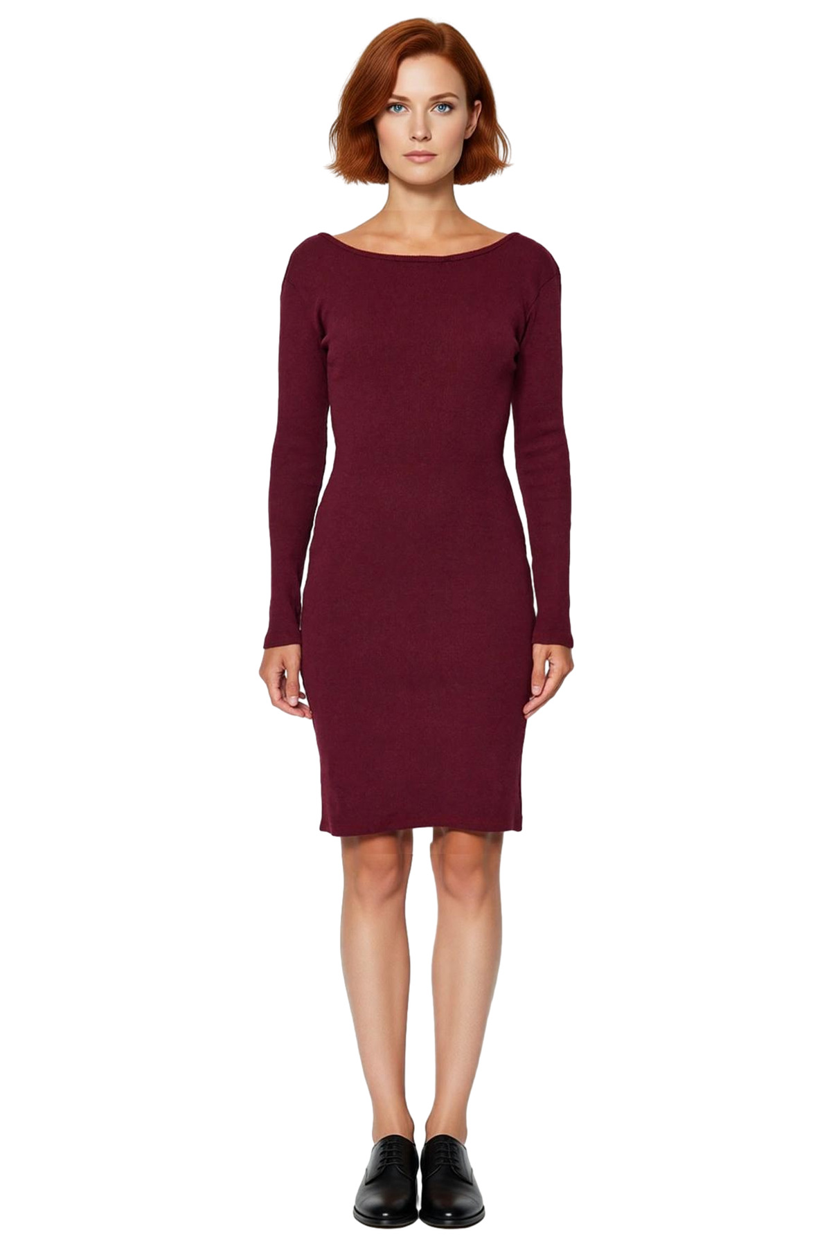 Ürün Özellikleri: Bodycon kalıp, polyester karışımlı materyal, düz desen, bisiklet yaka, standart uzun kol, örme rejenere kaşkorse kumaş, bordo renk, sırt dekolteli tasarım.