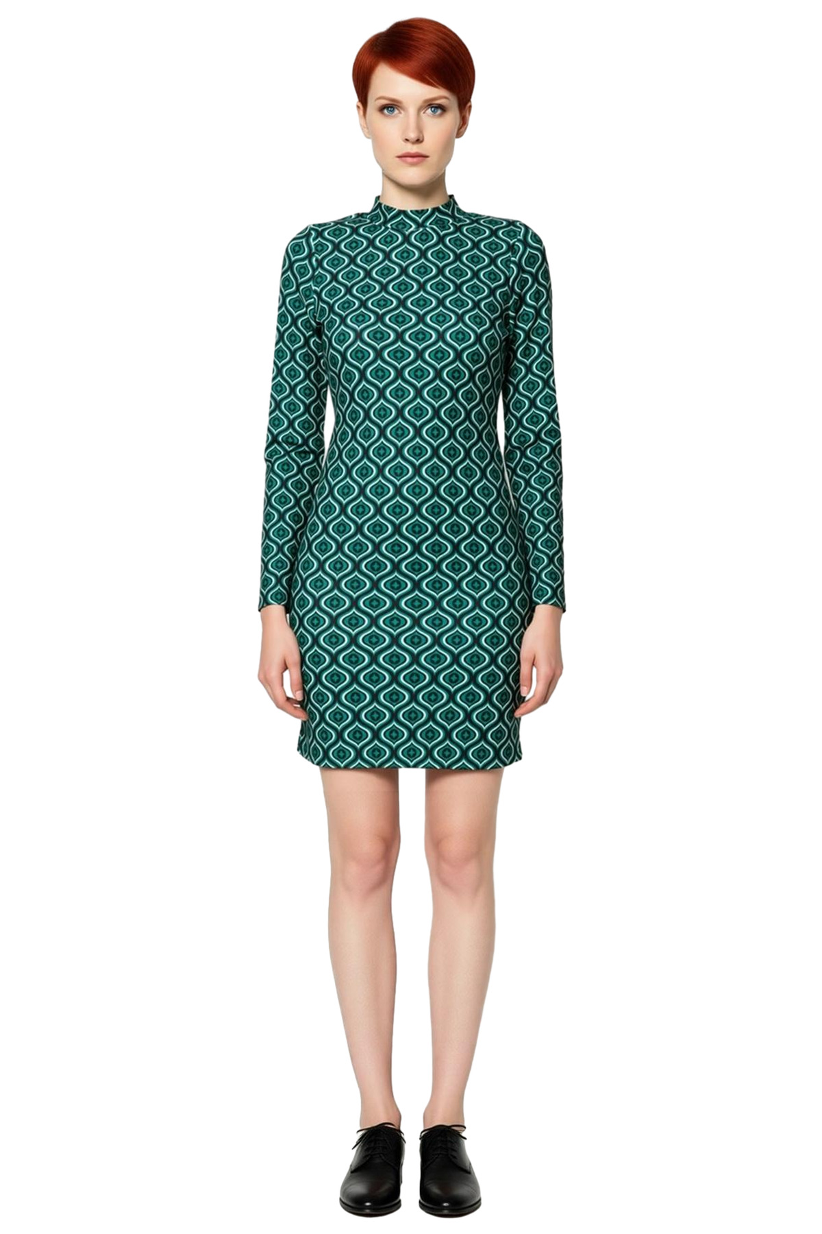 Ürün Özellikleri: Bodycon kalıp, polyester karışımlı materyal, geometrik desen, dik yaka, uzun ispanyol kol, örme kumaş, yeşil renk, astarsız tasarım.