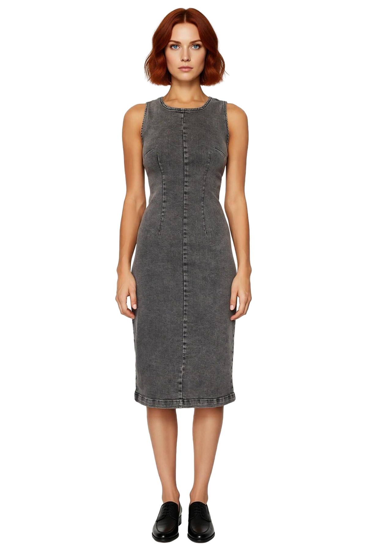 Ürün Özellikleri: Bodycon kalıp, denim materyal, düz desen, bisiklet yaka, kolsuz, comfort dokuma, antrasit renk.