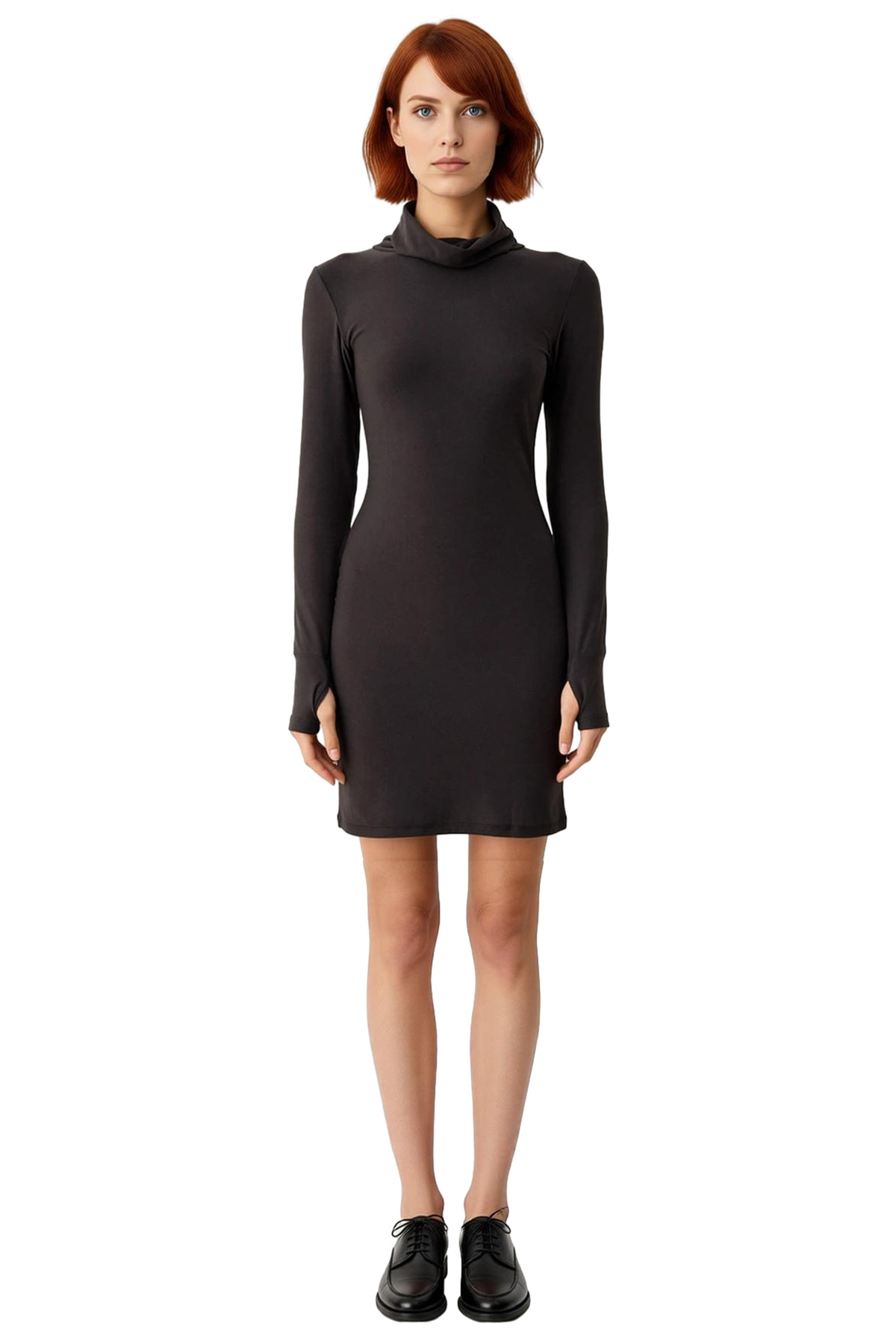 Ürün Özellikleri: Bodycon kalıp, polyester elastan materyal, düz desen, balıkçı yaka, standart kol, örme kumaş, siyah renk, astarsız tasarım.