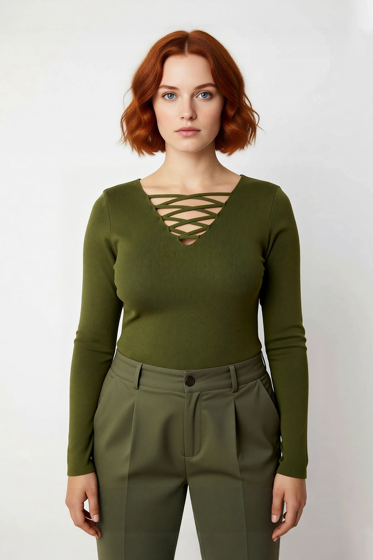 Kadınlar için tasarlanan bu şık triko kazak, fitted kalıbı sayesinde vücuda tam oturarak modern ve çekici bir görünüm sunar. %100 polyester materyali ile üretilen bu kazak, yumuşak dokusu ve esnek yapısıyla gün boyu üstün konfor sağlar. Haki rengi, doğal ve toprak tonlarının zarifliğini yansıtırken, düz deseni minimalist bir şıklık arayanlar için idealdir. Çapraz bağcıklı V yaka detayı, tasarıma özgün bir hava katarken, feminen ve sofistike bir stil yaratır. Bu kazak, tarzınızı ön plana çıkararak her ortamda dikkat çekmenizi sağlar.