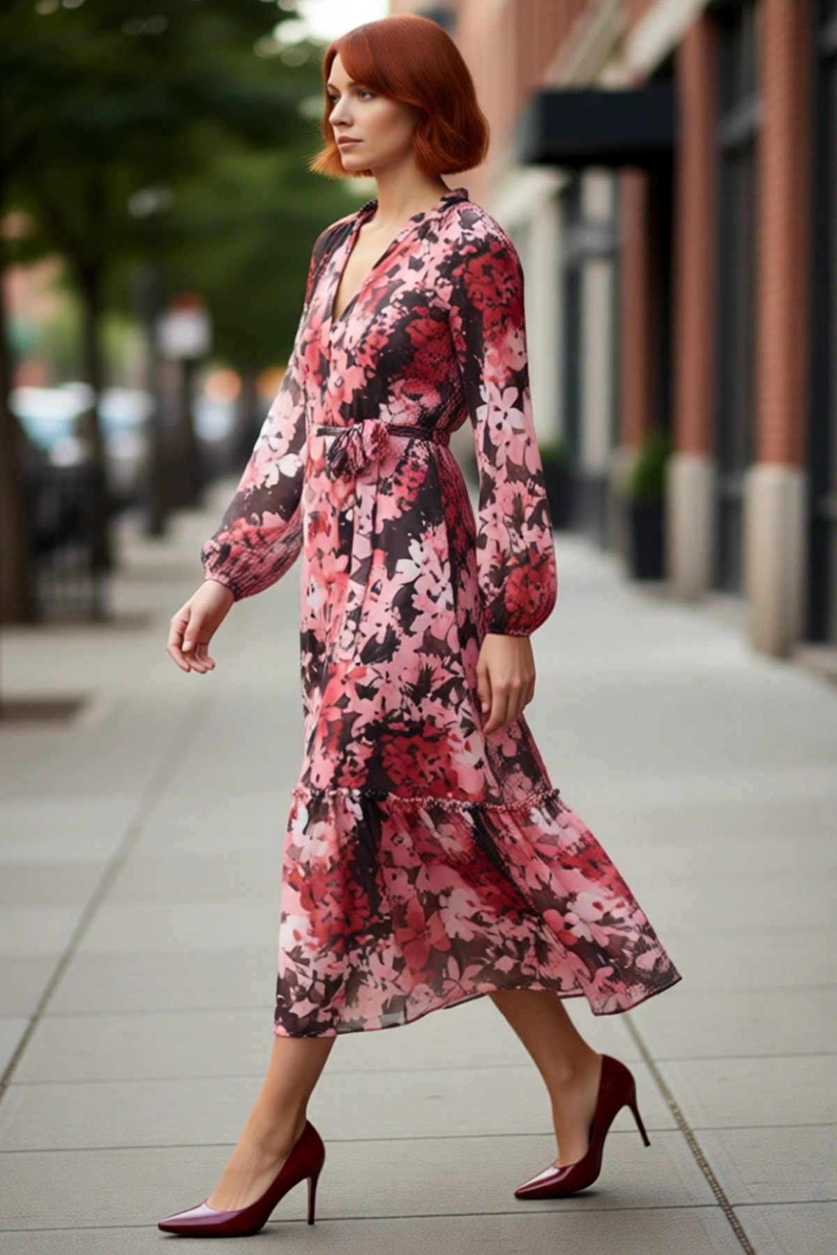 Kadın Bohem Şal Desenli Kuşaklı Midi Dokuma Elbise V Yaka Astarlı Uzun Kollu A Kesim Şifon Günlük