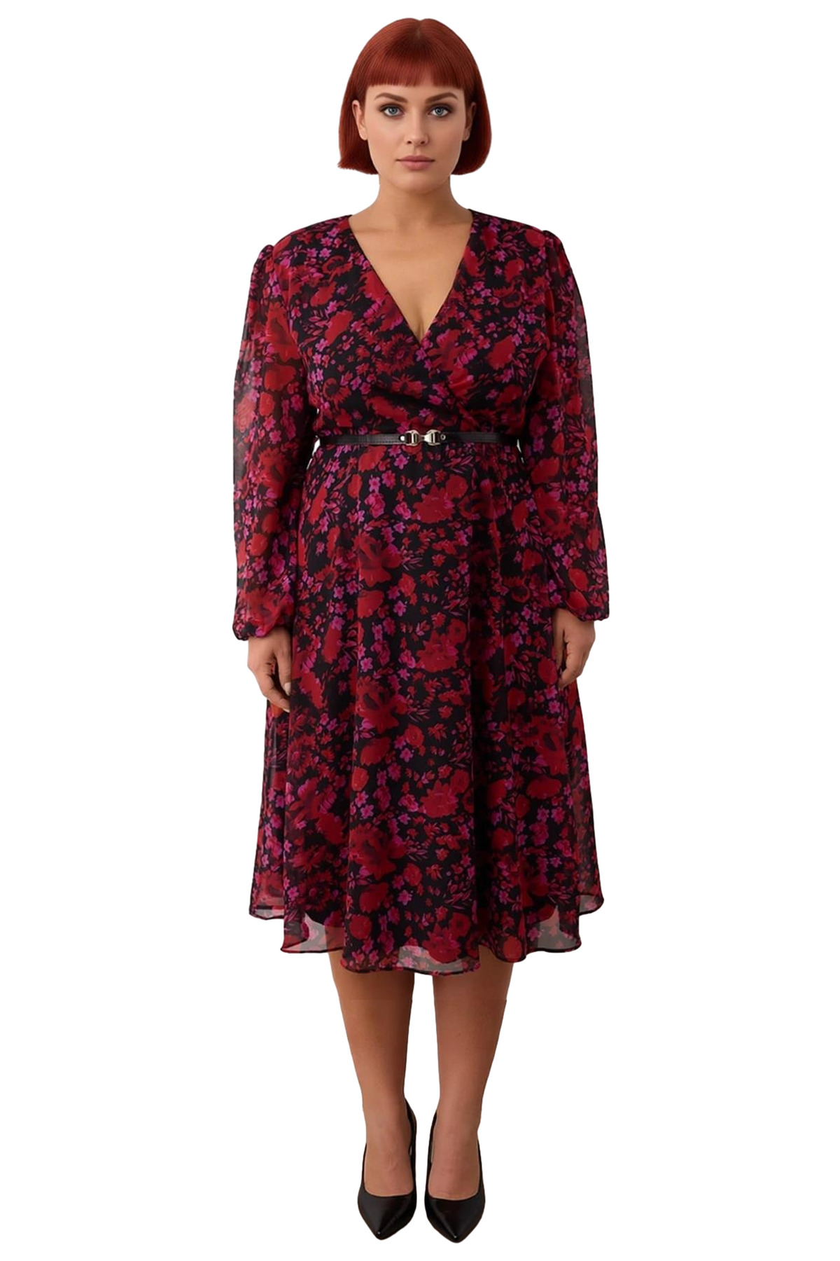 Kadın Bordo Çiçek Desenli Kruvaze Midi Boy Şifon Elbise Balon Kol V Yaka İlkbahar Sonbahar