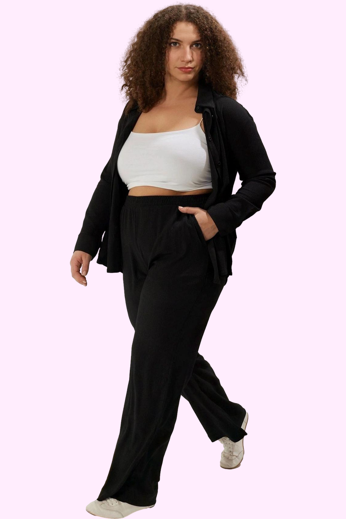 Büyük beden kadınlar için özel olarak tasarlanan bu siyah pantolon, şıklığı ve rahatlığı bir araya getiriyor. Yüksek bel ve boru paça tasarımıyla modern ve trend bir görünüm sunarken, yumuşak bürümcük dokusu sayesinde gün boyu konfor sağlar. %99 Polyester, %1 Elastan karışımıyla üretilen pantolon, nefes alabilir yapısıyla yaz aylarında bile serin kalmanıza yardımcı olur. Düz, sade tasarımı sayesinde her ortama ve her tarza uyum sağlar. İş görüşmelerinden günlük aktivitelere kadar birçok ortamda rahatlıkla kullanabilirsiniz.