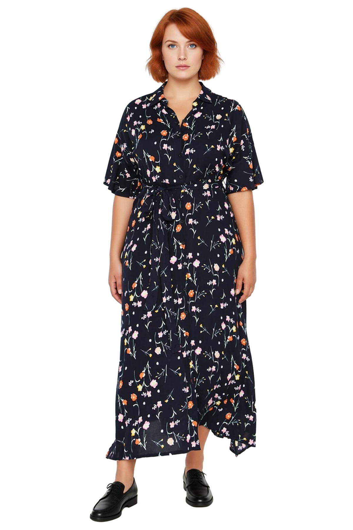 Ürün Özellikleri: A-line kalıp, %100 viskoz materyal, çiçekli desen, gömlek yaka, kısa melek kol, dokuma kumaş, lacivert renk.