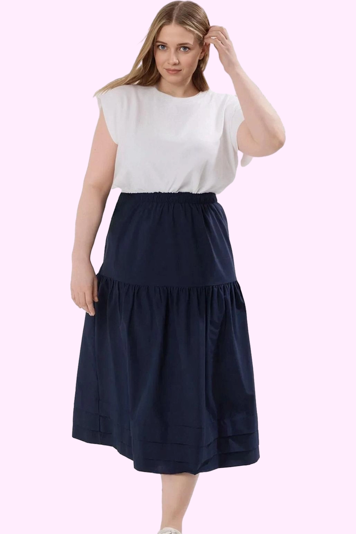 Gardırobunuz için mükemmel bir tamamlayıcı olan bu büyük beden lacivert etek, günlük yaşamınızda şıklığı ve rahatlığı bir arada sunar. A-line kesimiyle her vücut tipine uyum sağlayan etek, yüksek kaliteli Finike dokuma kumaşından üretilmiştir. Nefes alan ve yumuşak yapısı sayesinde, gün boyu konforlu bir kullanım sunar. Midi boyu ile hem modern hem de klasik bir görünüm elde etmenizi sağlar.