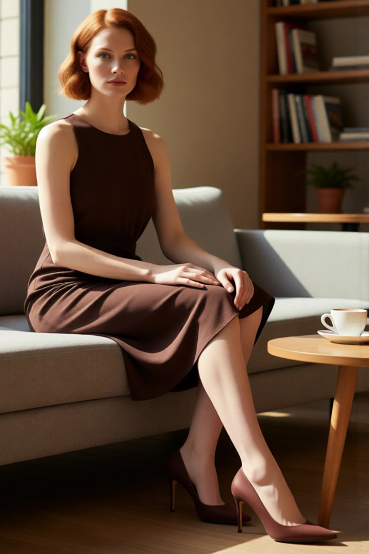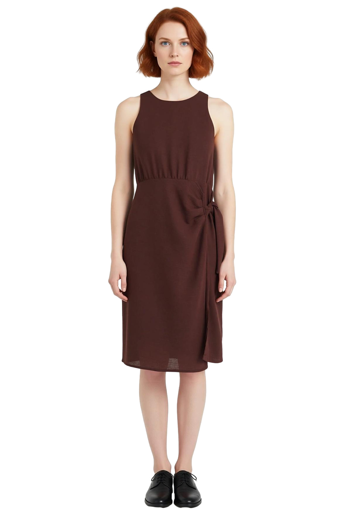 Ürün Özellikleri: A-line kalıp, 100% polyester materyal, düz desen, bisiklet yaka, kolsuz, dokuma kumaş, kahverengi renk, yan bağlama ve yırtmaç detayı.