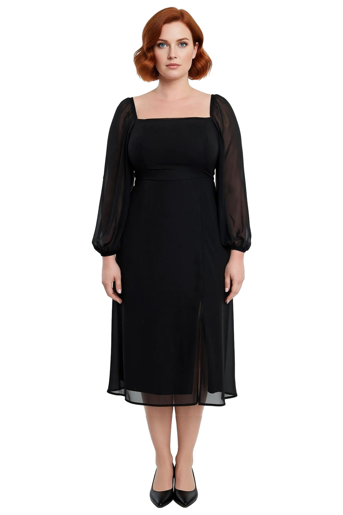 Ürün Özellikleri: A-line kalıp, polyester materyal, düz desen, kare yaka, balon kol, dokuma şifon kumaş, siyah renk, astarlı tasarım.