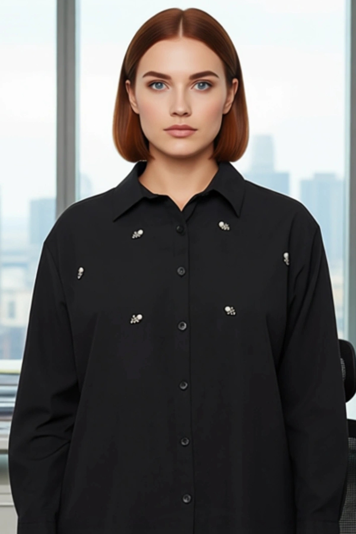 Nefes alabilen ve rahat bir kullanım sunan poplin kumaştan üretilen bu gömlek, büyük beden kadınlar için özel olarak tasarlandı. Taş işlemeli detaylar gömleğe şıklık katarken, siyah rengi her türlü kombinle uyum sağlıyor. Regular kalıp ve uzun kollar, rahat bir kullanım sunuyor. Cepsiz tasarımı minimal bir tarz oluştururken, düğmeli kapanma şekli ise kullanım kolaylığı sağlıyor. Günlük kullanım için ideal olan bu gömlek, jean pantolonlar, etekler veya şortlarla mükemmel bir uyum yakalıyor.