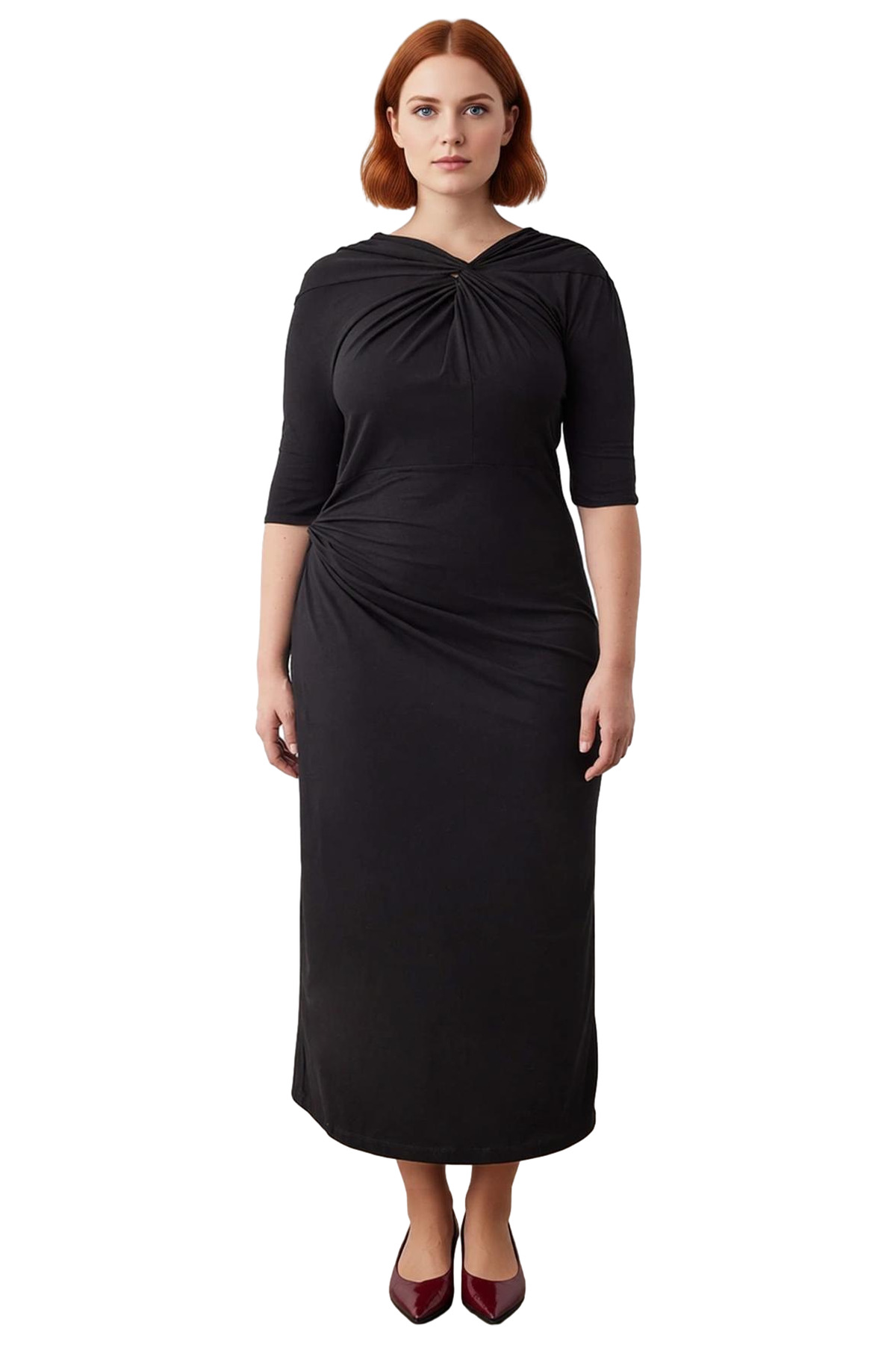 Kadınlar için tasarlanan bu büyük beden siyah maxi elbise, shift kalıbıyla modern bir siluet sunar ve gün boyu süren konfor vaat eder. %96 pamuk ve %4 elastan içeren örme süprem kumaşı, nefes alabilir yapısıyla cildinize dost bir dokunuş sağlarken, esnekliği sayesinde hareket özgürlüğü sunar. Düz deseni, minimalist bir şıklık yaratırken, yaka ve beldeki düğüm detayları elbiseye özgün ve çekici bir karakter kazandırır. Bu tasarım, ilkbahar ve sonbahar mevsimlerinde rahatlığı ve zarafeti bir araya getirir.