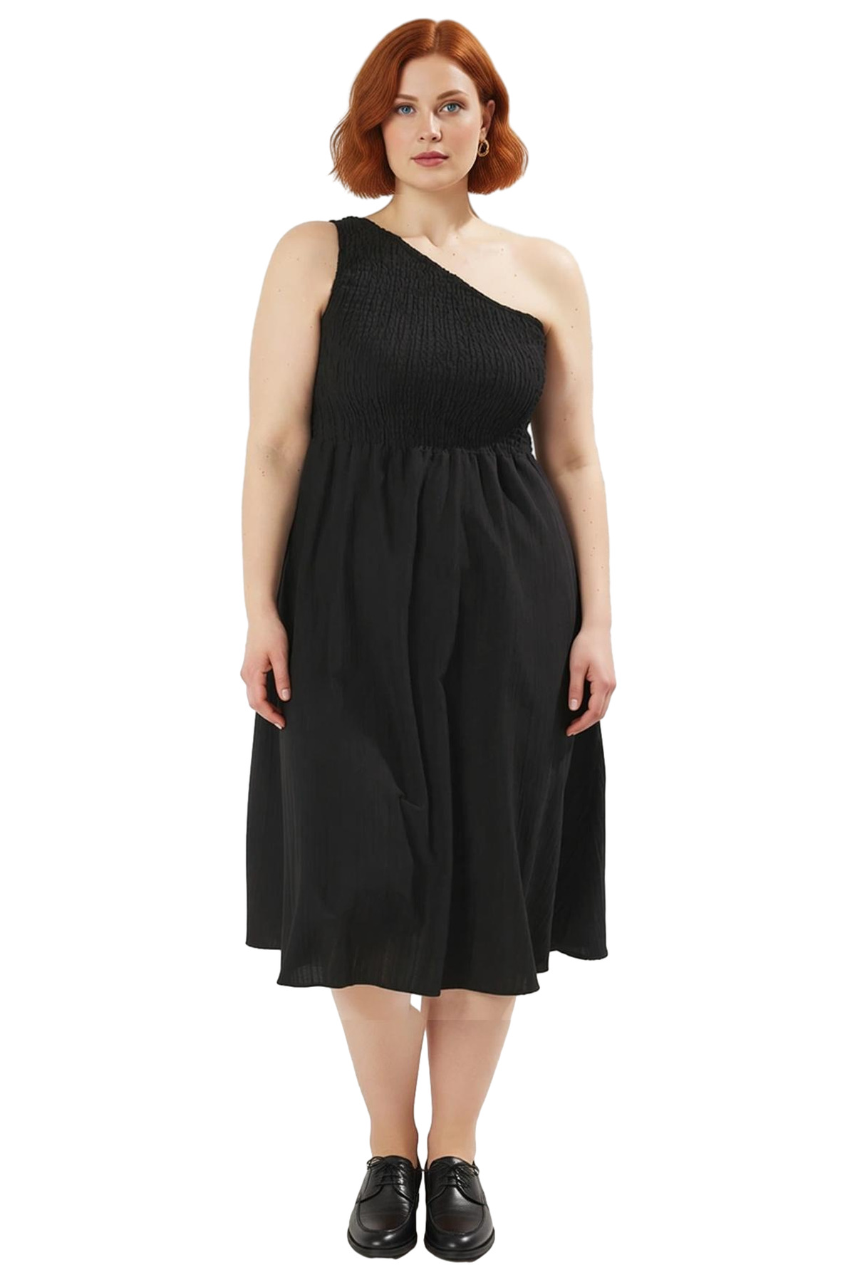 Ürün Özellikleri: A-line kalıp, polyester elastan materyal, düz desen, asimetrik yaka, tek kol, dokuma kumaş, siyah renk.