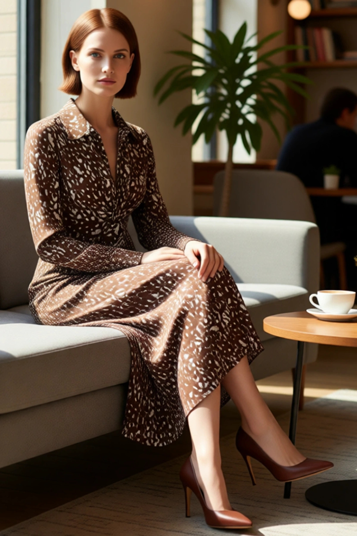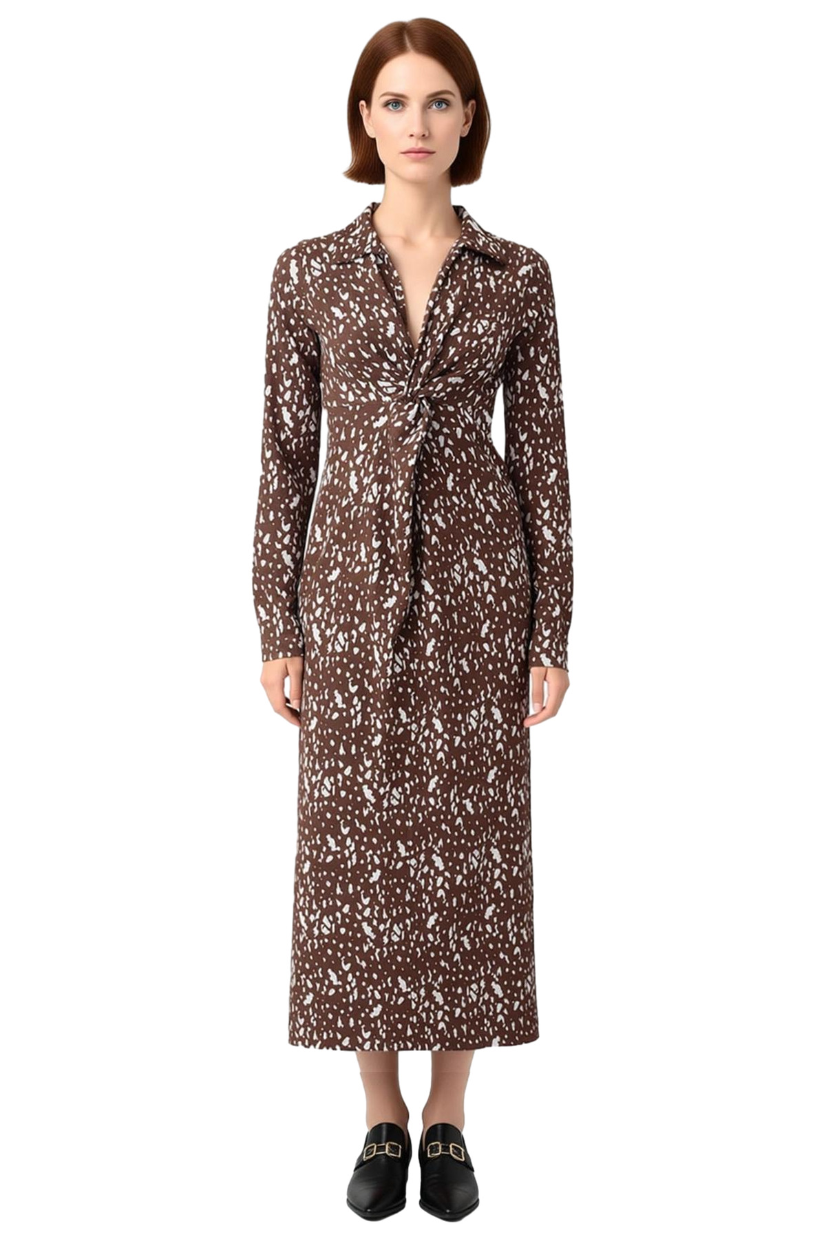 Ürün Özellikleri: A-line kalıp, 96% Polyester 4% Elastan materyal, baskılı desen, polo yaka, standart kol, örme kumaş, kahverengi renk.
