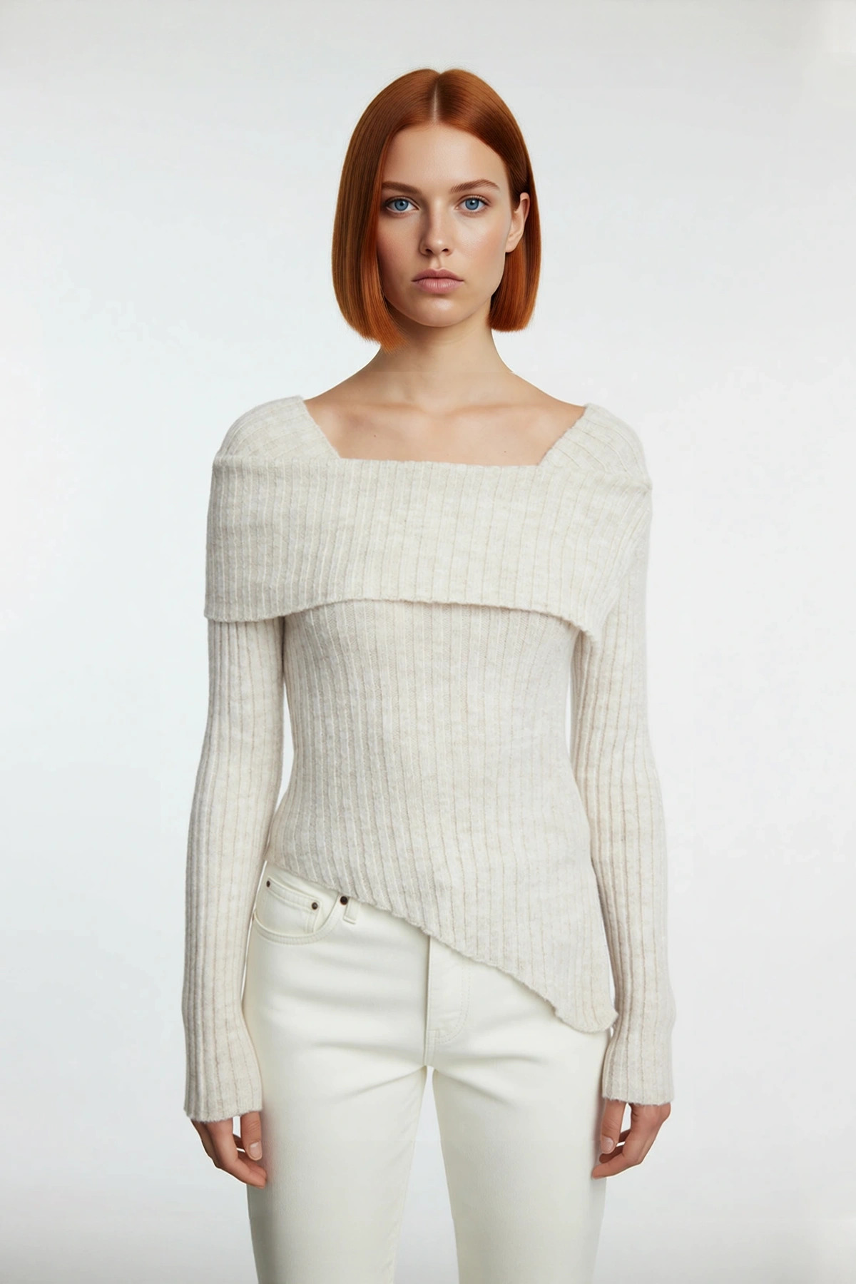 Ürün Özellikleri: Fitted kalıp, akrilik polyester materyal, düz desen, carmen yaka, standart kol, triko kumaş, bej renk, baskısız tasarım.