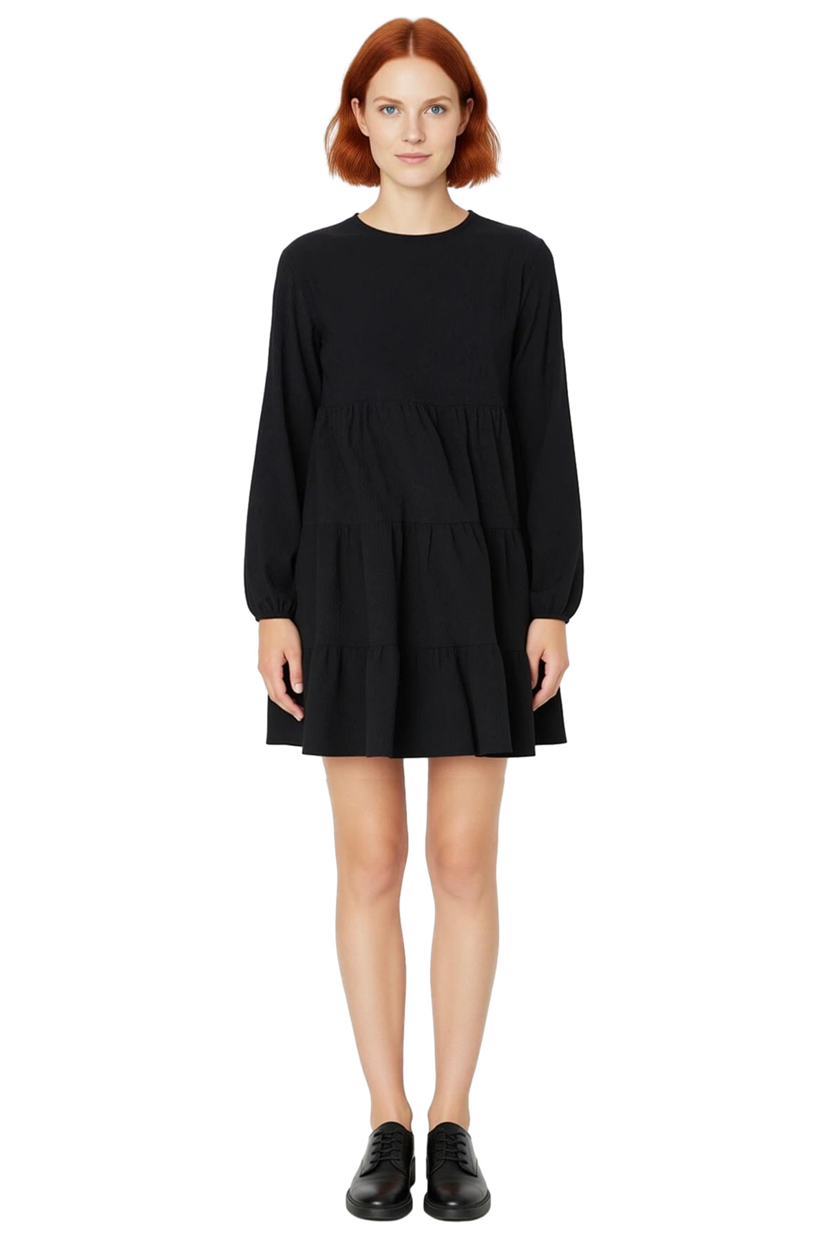 Ürün Özellikleri: A-line kalıp, örme materyal, düz desen, bisiklet yaka, balon kol, bürümcük kumaş, siyah renk.