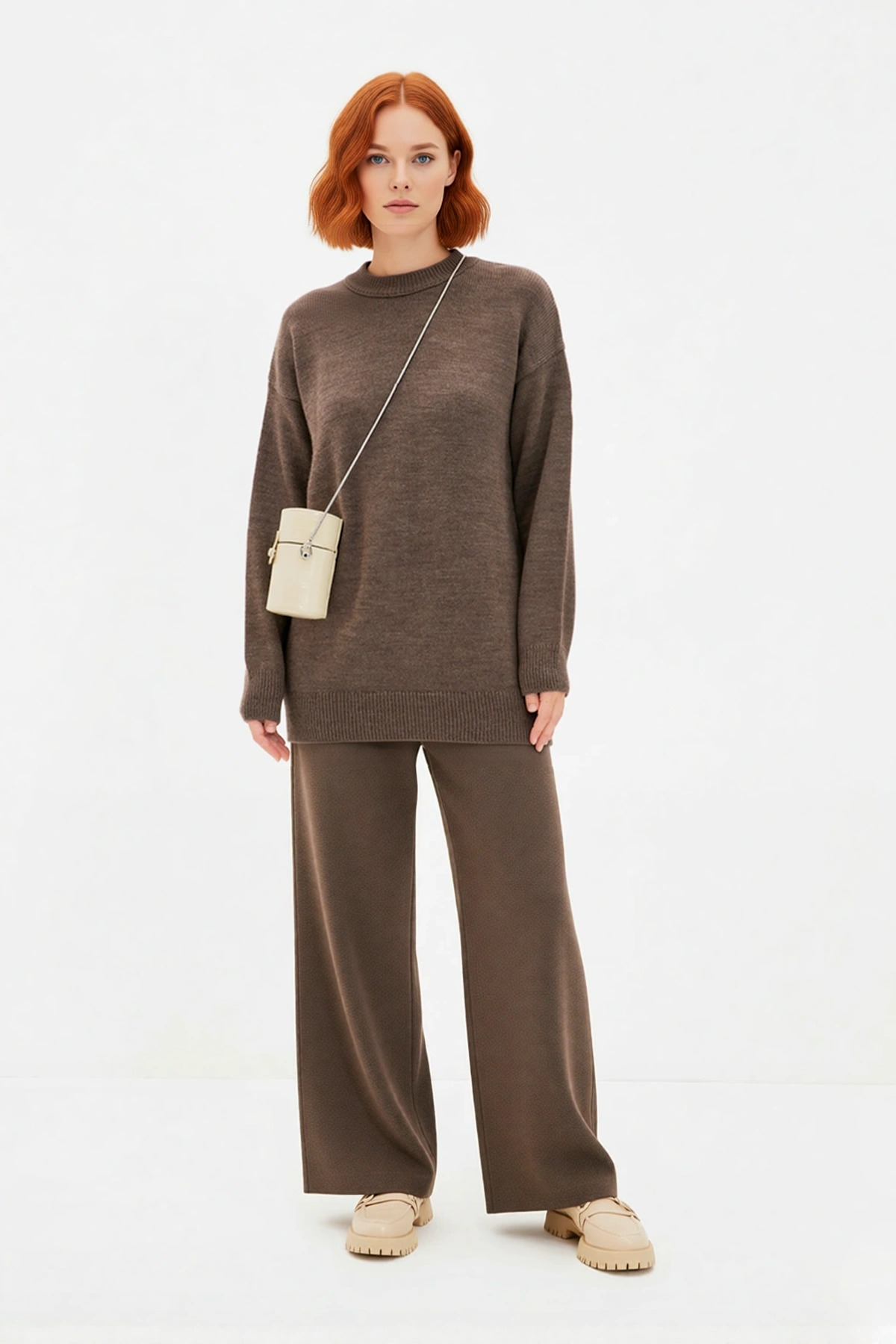 Ürün Özellikleri: Regular kalıp, %80 akrilik %20 polyester materyal, düz desen, bisiklet yaka, standart kol, triko kumaş, kahverengi renk, cepsiz tasarım.