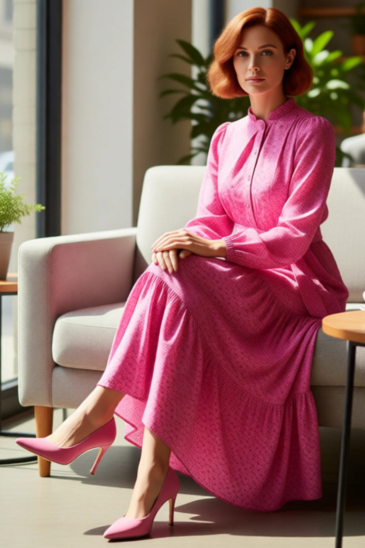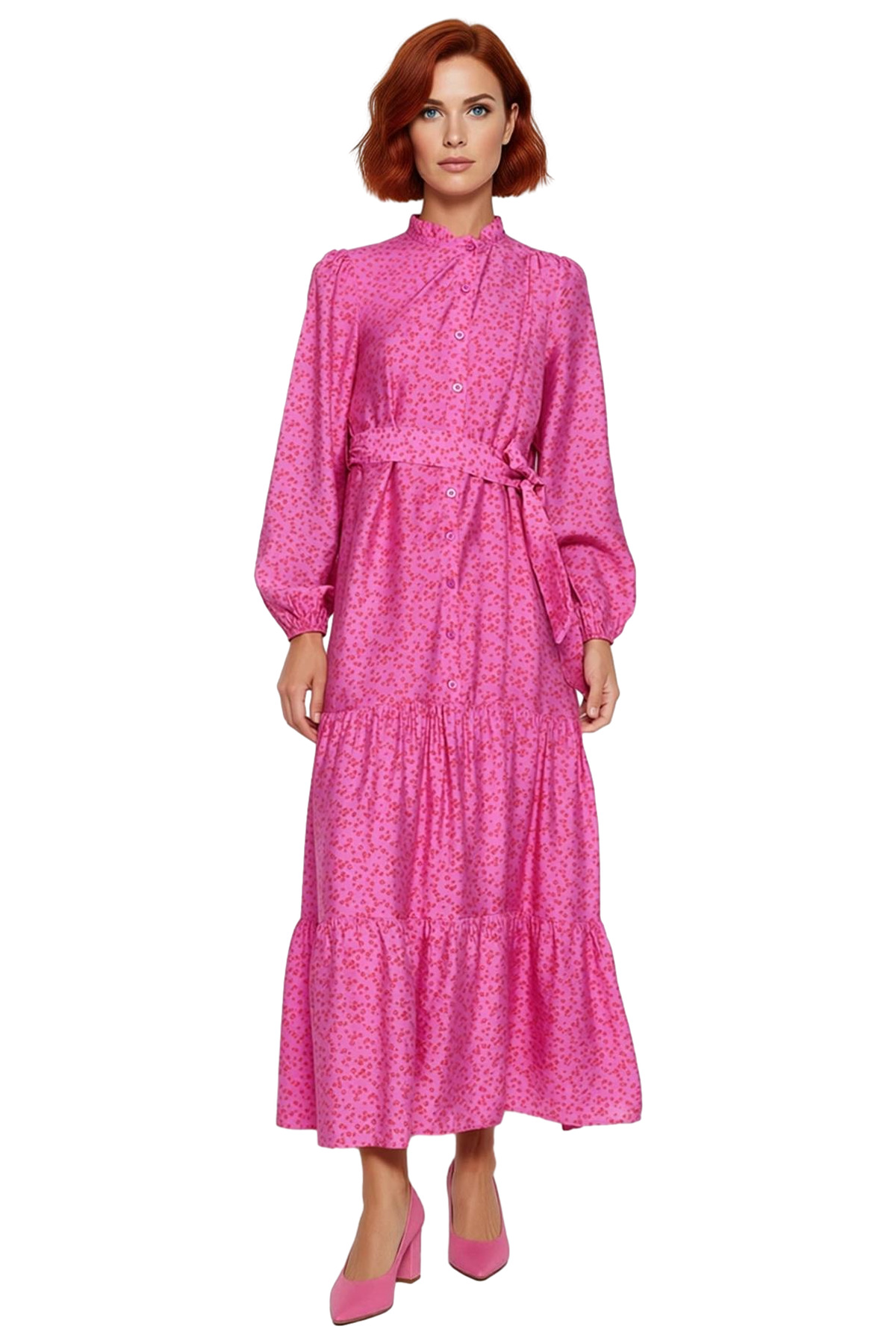 Ürün Özellikleri: Shift kalıp, 85% viskoz 15% poliamid materyal, çiçekli desen, gömlek yaka, standart kol, dokuma kumaş, pembe renk, kuşaklı tasarım, maxi boy, astarlı.