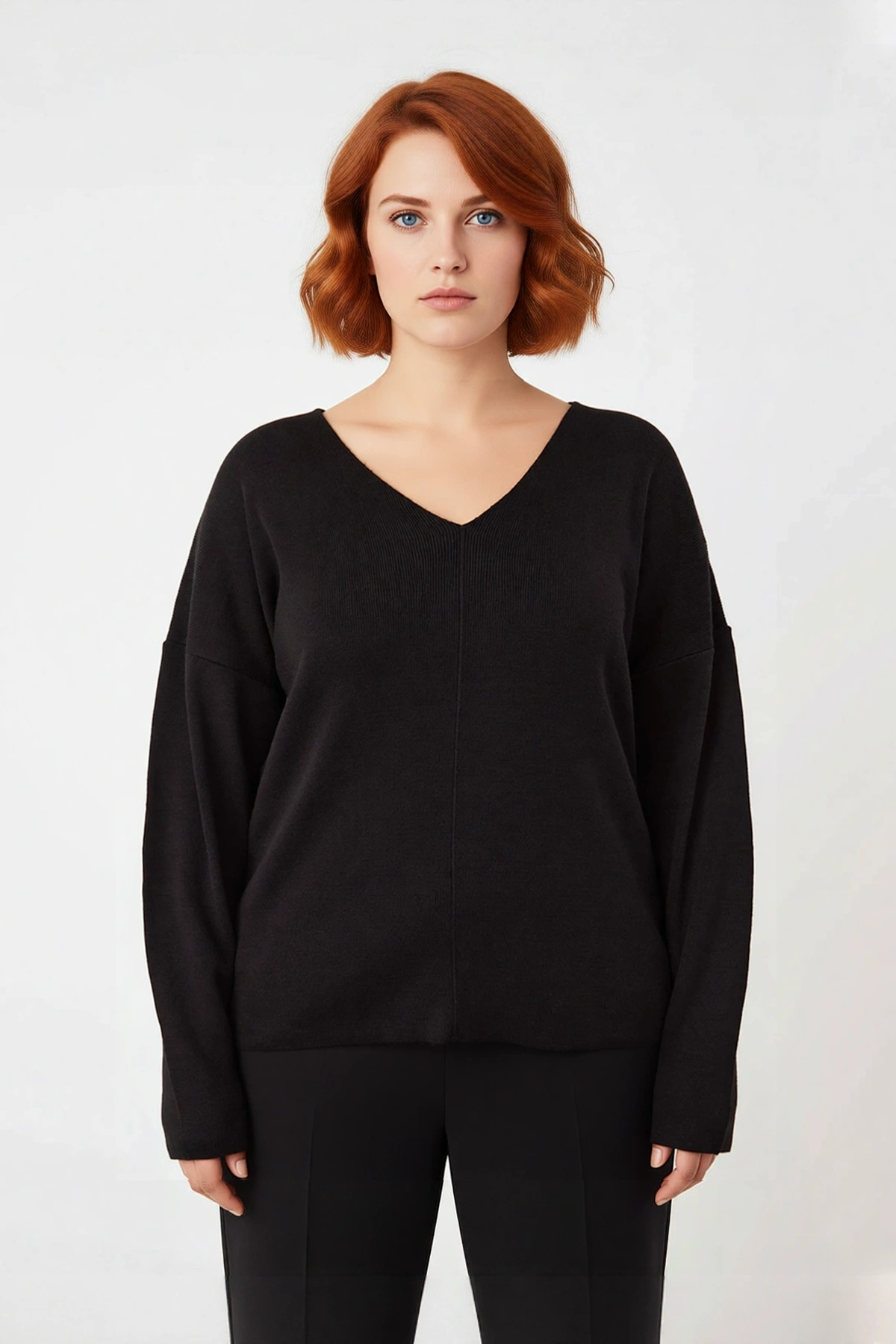 Ürün Özellikleri: Regular kalıp, akrilik materyal, düz desen, V yaka, düşük kol, triko kumaş, siyah renk.