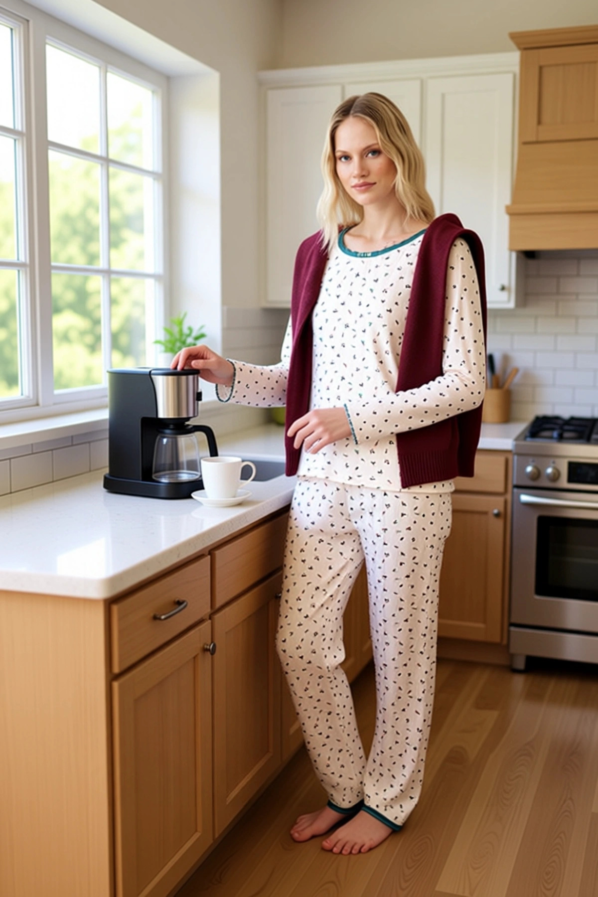 Bu ekru renkteki pijama takımı, %100 pamuk içeriğiyle cildinize maksimum konfor sunar. Üzerindeki zarif çiçek desenleri, takıma feminen bir dokunuş katarken, ince dantel detayları ise sofistike bir estetik sunar. Regular kalıbı sayesinde rahat bir kullanım sağlayan takım, örme kumaş yapısıyla gün boyu süren bir yumuşaklık hissi verir. Kaşkorse dokuma tekniği, kumaşa esneklik kazandırarak hareket kabiliyetinizi kısıtlamaz. Bu pijama takımı, evde geçirilen zamanı daha keyifli hale getirmek isteyen kadınlar için özel olarak tasarlanmıştır. Lounge ve ev ortamları için ideal olan bu ürün, hem şık hem de rahat bir seçenektir. Takımın bisiklet yaka üstü, uzun kollu ve standart kesimlidir, bu da ona klasik bir görünüm kazandırır. Pantolonun beli normal bel olarak tasarlanmış olup, boru paça kesimi modern bir silüet oluşturur. Yaka ve pantolon paçalarındaki dantel işlemeler, takıma zarif bir hava katarak onu sıradan pijama takımlarından ayırır. %100 pamuk materyali, kumaşın nefes alabilirliğini artırarak cildinizin gün boyu ferah kalmasını sağlar. Bu pijama takımı, yumuşak dokusuyla uyku kalitenizi artırmaya yardımcı olur ve rahat bir uyku deneyimi sunar. Kış mevsiminin soğuk günlerinde sıcaklık ve konfor arayanlar için bu %100 pamuk pijama takımı biçilmiş kaftandır. Bu takımı, rahat bir eşofman altı, tayt veya şık bir ev pantolonu ile tamamlayabilirsiniz. Ayakkabı olarak ise yumuşak ev terlikleri veya spor ayakkabılar tercih edilebilir. Takımın uzun ömürlü olması için düşük sıcaklıkta ve hassas programda yıkanması önerilir.