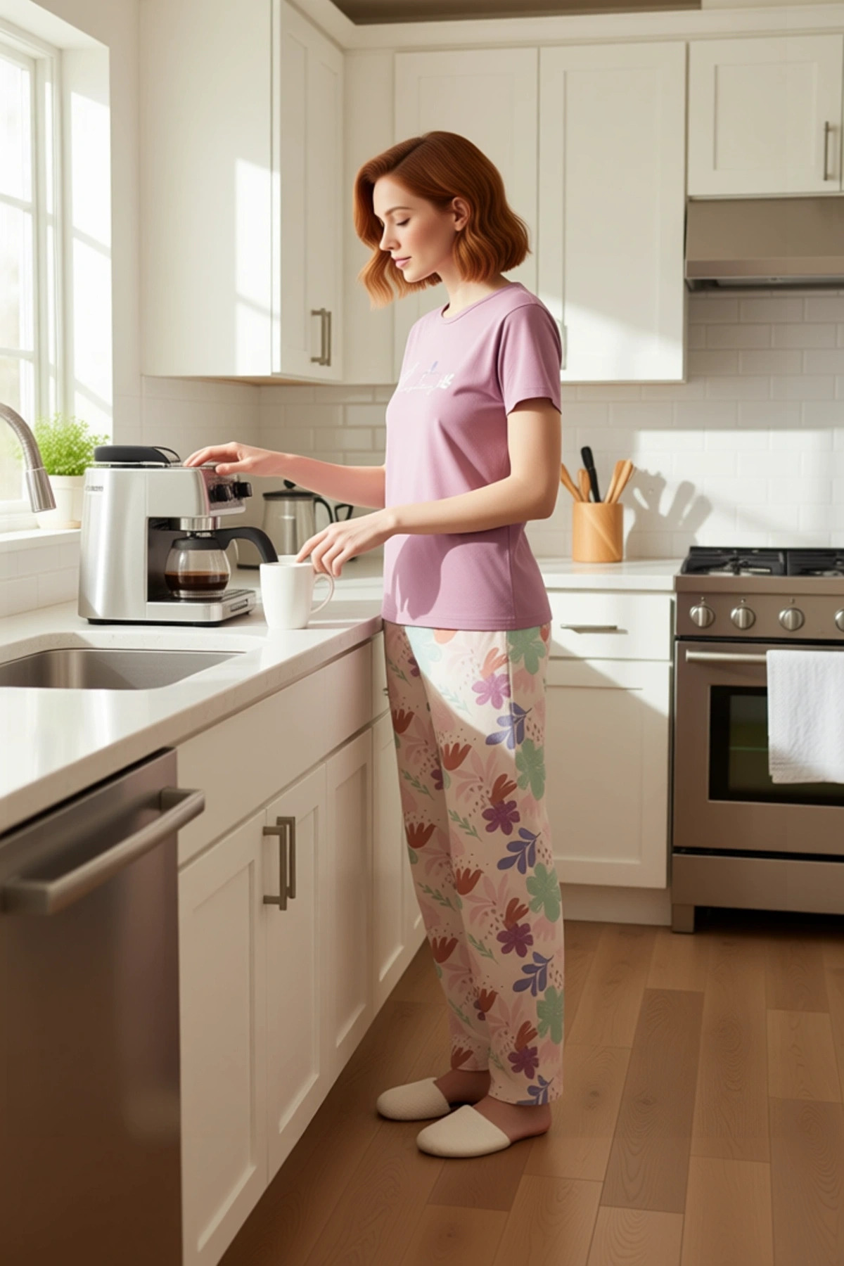 Bu kadın pijama takımı, evdeki stilinizi yansıtmak için tasarlandı. Üst kısımda yer alan bisiklet yaka ve kısa kollu tişört, rahat bir kesime sahip. Pantolon ise boru paça jogger modeliyle hem şık hem de konforlu bir kullanım sunuyor. Takımın tamamı %100 pamuk ipliğinden üretilmiş olup, 30/1 openend süprem dokuma tekniğiyle hazırlanmıştır. Bu sayede kumaş, yumuşak dokusu ve nefes alabilirliği ile gün boyu rahatlık sağlar. Tişörtün üzerinde zarif bir çiçek deseni ve “flowers” yazısı bulunuyor. Pantolon ise bu temayı tamamlayan, canlı ve pastel tonlarda çiçek motifleriyle bezeli. Bu özgün desenler, takıma dinamik ve feminen bir hava katıyor. Regular kalıbı sayesinde her vücut tipine uyum sağlayan bu pijama takımı, maksimum konfor sunar. Bisiklet yaka, boyun bölgesinde rahatlık sağlarken, standart kesim kısa kollar sıcak havalarda serinlik hissi verir. Jogger tarzı boru paça pantolon, normal bel kesimi ile gün boyu süren bir rahatlık sunar. Örme kumaşın yumuşak dokusu cilde nazikçe temas eder ve günün her anında kendinizi iyi hissetmenizi sağlar. Lounge ve ev ortamı için özel olarak tasarlanmış bu takım, cool ve konforlu bir yaşam tarzını benimseyen kadınlar için ideal bir seçenektir. Günlük ev aktivitelerinizde veya dinlenme anlarınızda size eşlik edecek bu pijama takımı, hem şık hem de fonksiyonel bir parça olarak gardırobunuzda yerini alacaktır. İlkbahar ve sonbahar mevsimleri için biçilmiş kaftan olan bu pijama takımı, serin akşamlarda sizi sıcak tutarken, hafif yapısıyla bunaltmaz. Bu takımı, rahat bir ev terliği veya spor ayakkabı ile tamamlayarak ev içinde keyifli vakit geçirebilirsiniz. Dışarıda giymek isterseniz, üzerine salaş bir hırka veya sweatshirt ekleyerek modern bir görünüm elde edebilirsiniz. Pantolonun çiçekli deseni, basic bir tişört ile de uyum sağlayarak farklı kombinler yaratmanıza olanak tanır. Makinede nazikçe yıkanması tavsiye edilir, böylece kumaşın dokusu ve renkleri uzun süre korunur.