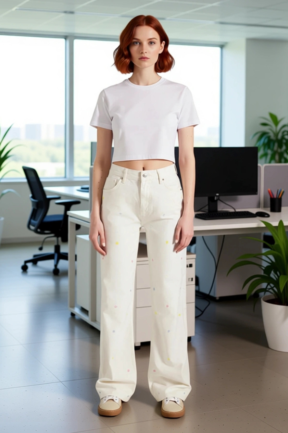 Bu kadın denim pantolon, geniş paça kesimi ve %100 pamuk materyali ile hem rahat hem de stil sahibi bir seçenek sunuyor. Üzerindeki minik renkli çiçek nakışları, pantolona sevimli ve dikkat çekici bir detay ekliyor. Normal bel yüksekliği, klasik ve zamansız bir siluet sağlarken, wide leg kalıp modern bir görünüm vadediyor. Rigid denim dokusu, pantolonun formunu koruyarak gün boyu şık durmasını sağlıyor. Beyaz rengi, her türlü üst giyimle kolayca uyum sağlayarak çok yönlü bir kullanım sunuyor. Bu jean, günlük şıklığınızı tamamlayacak ve gardırobunuza neşeli bir dokunuş katacaktır. Üretim yeri Türkiye olan bu ürün, kalitesi ve şık tasarımıyla öne çıkıyor. Bu wide leg jean pantolon, rahatlığı ön planda tutan bir tasarıma sahiptir. Geniş paça kesimi, hareket özgürlüğü sağlarken, normal bel detayı konforlu bir oturuş sunar. Üzerindeki zarif çiçek nakışları, pantolona feminen bir hava katarken, pastel renk tonları ile yumuşak bir estetik sunar. %100 pamuk kumaşı, cildinize nazik davranır ve nefes alabilen yapısı sayesinde özellikle sıcak havalarda rahatlık sağlar. Bu jean, hem günlük kullanımda hem de özel günlerde şık bir alternatif olarak tercih edilebilir. Modern ve trend bir görünüm arayanlar için ideal bir seçimdir. Yaz ve ilkbahar mevsimleri için biçilmiş kaftan olan bu pantolon, hafifliği ve ferahlatıcı rengi ile dikkat çekiyor. Kombin önerisi olarak, bu jean’i basic bir tişört, keten bir gömlek veya şık bir bluz ile tamamlayabilirsiniz. Altına beyaz spor ayakkabılar, platform sandaletler veya şık babetler tercih edebilirsiniz. Daha spor bir görünüm için renkli bir sweatshirt ile de kombinlenebilir. Bu jean’in bakımı için hassas yıkama programı ve düşük sıcaklıkta ütüleme önerilir.