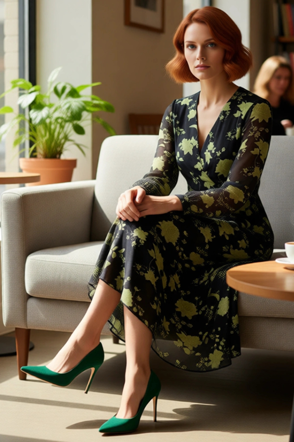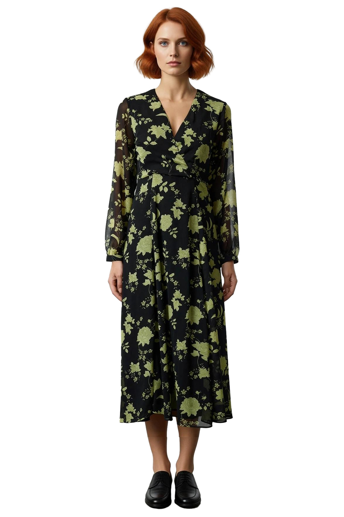 Kadın Çiçekli A Kesim Midi Boy Uzun Kollu Dokuma V Yaka Elbise Gündüz Gece Şık Kombinler Kaliteli